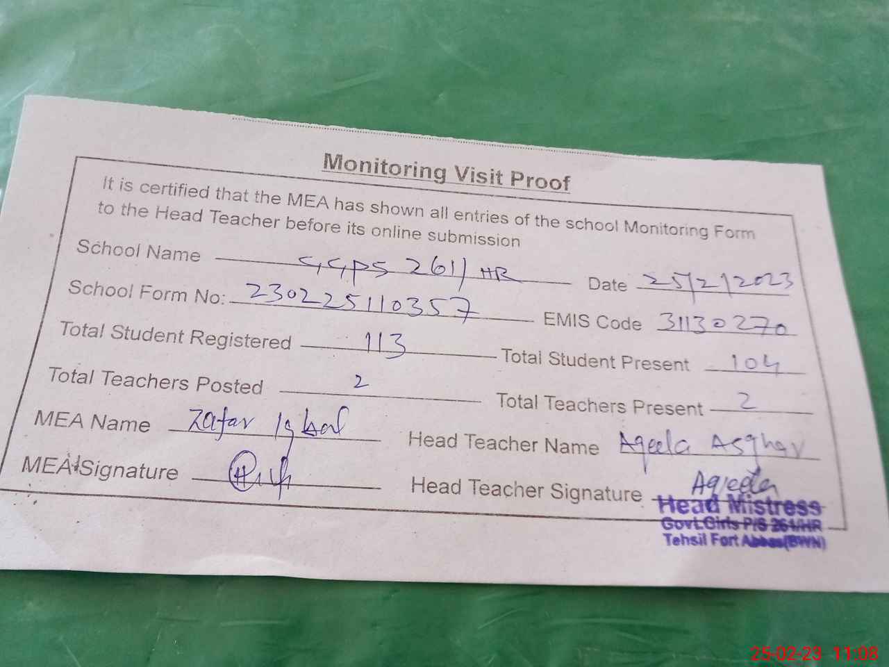 | Attendance Register | Head Teacher | MEA with School | Visit Proof |