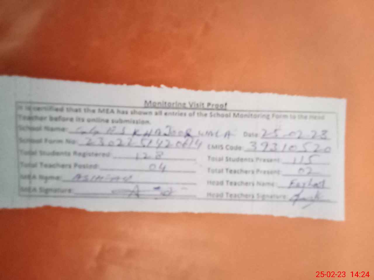 | Attendance Register | Head Teacher | MEA with School | Visit Proof |