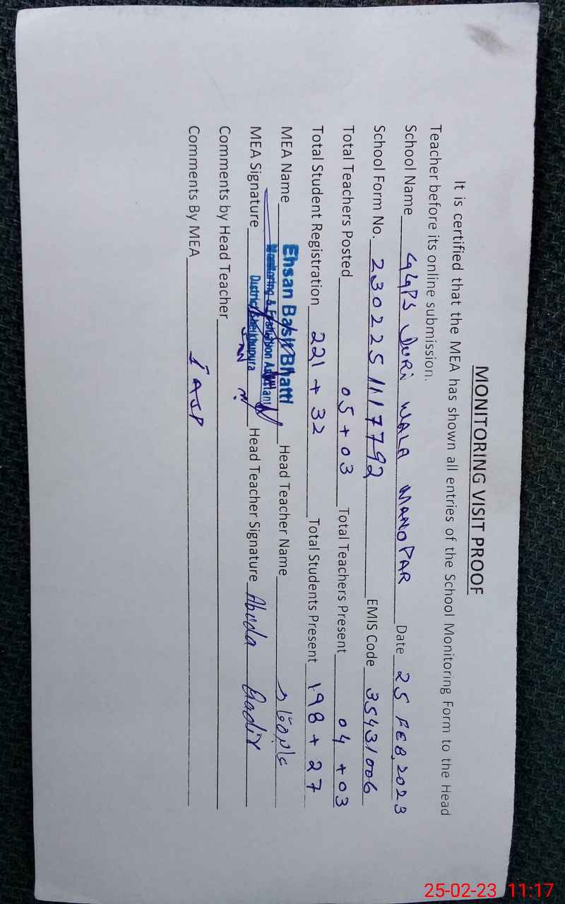 | Attendance Register | Head Teacher | MEA with School | Visit Proof |