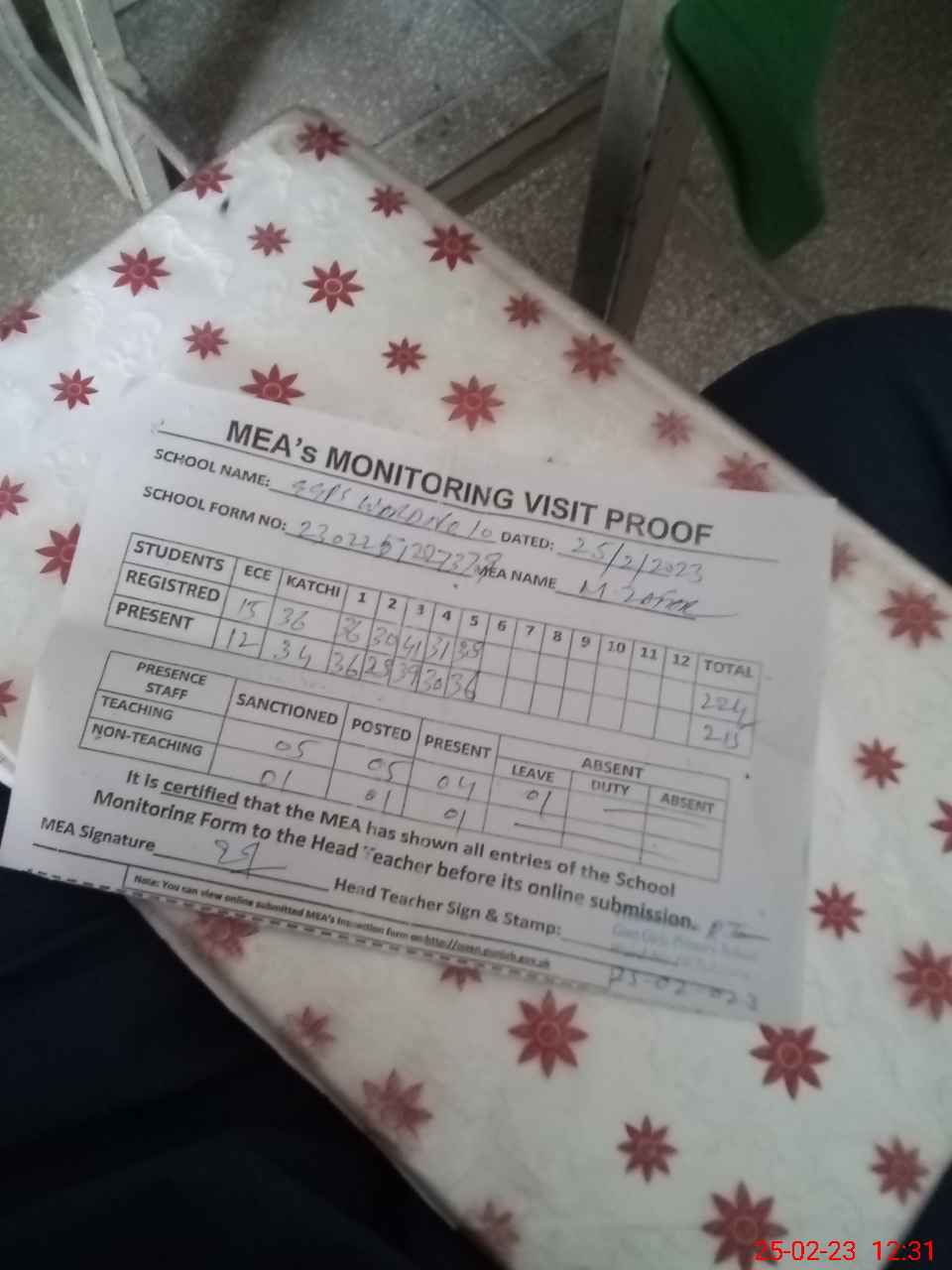 | Attendance Register | Head Teacher | MEA with School | Visit Proof |