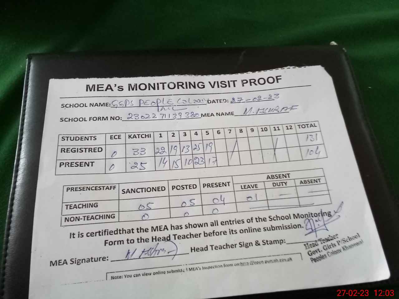 | Attendance Register | Head Teacher | MEA with School | Visit Proof |