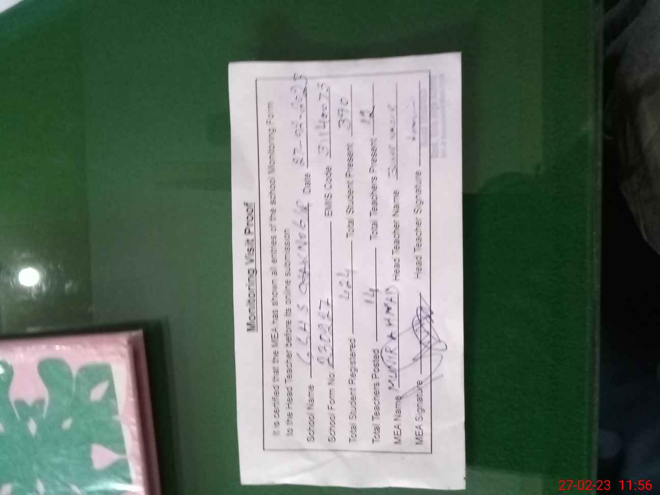 | Attendance Register | Head Teacher | MEA with School | Visit Proof |