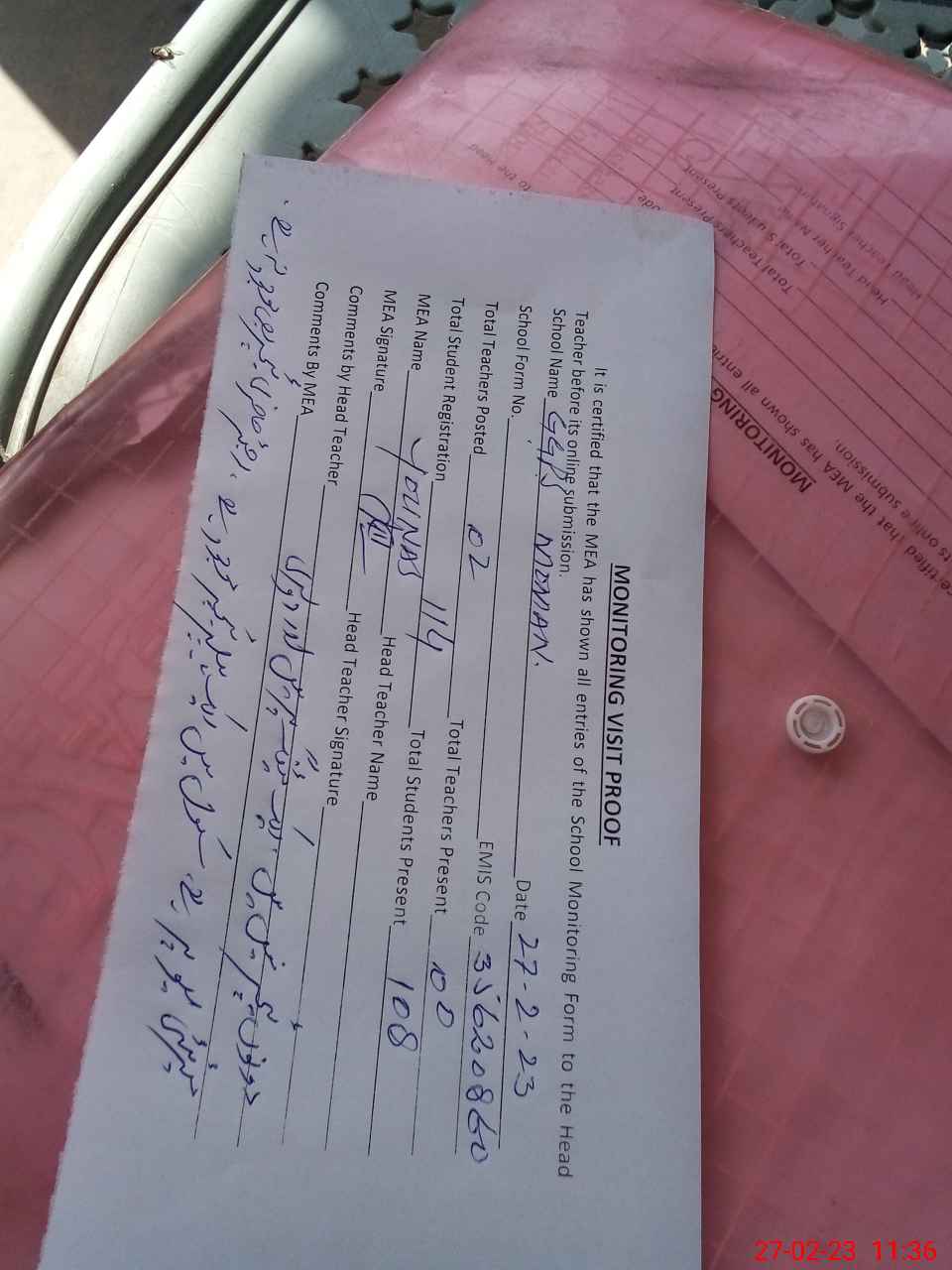 | Attendance Register | Head Teacher | MEA with School | Visit Proof |