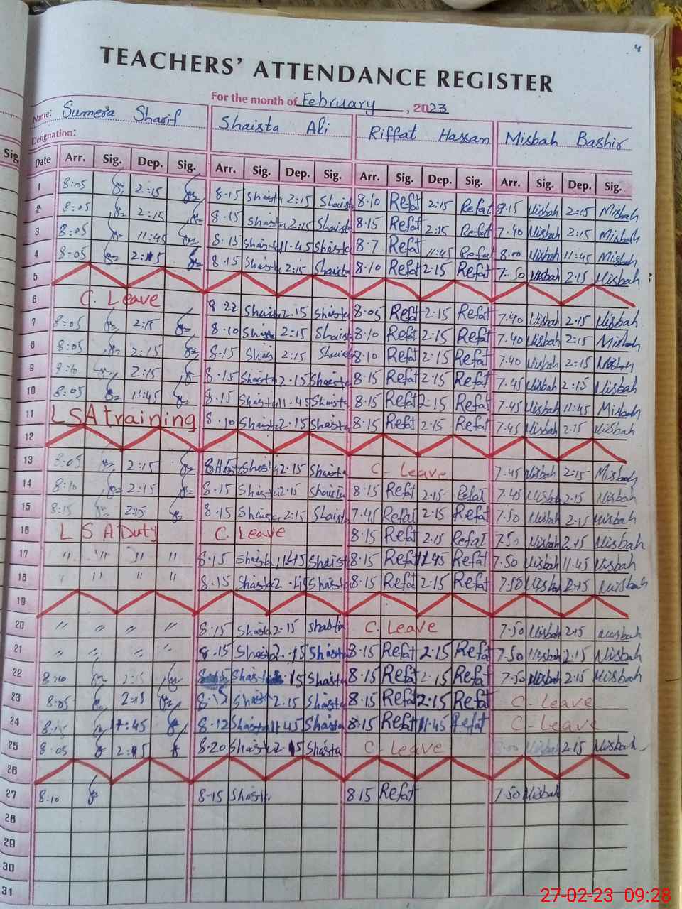 | No. of Students Present - Female | 0 | 0 | 23 | 21 | 11 | 10 | 15 | 28 | 108 | |||||||