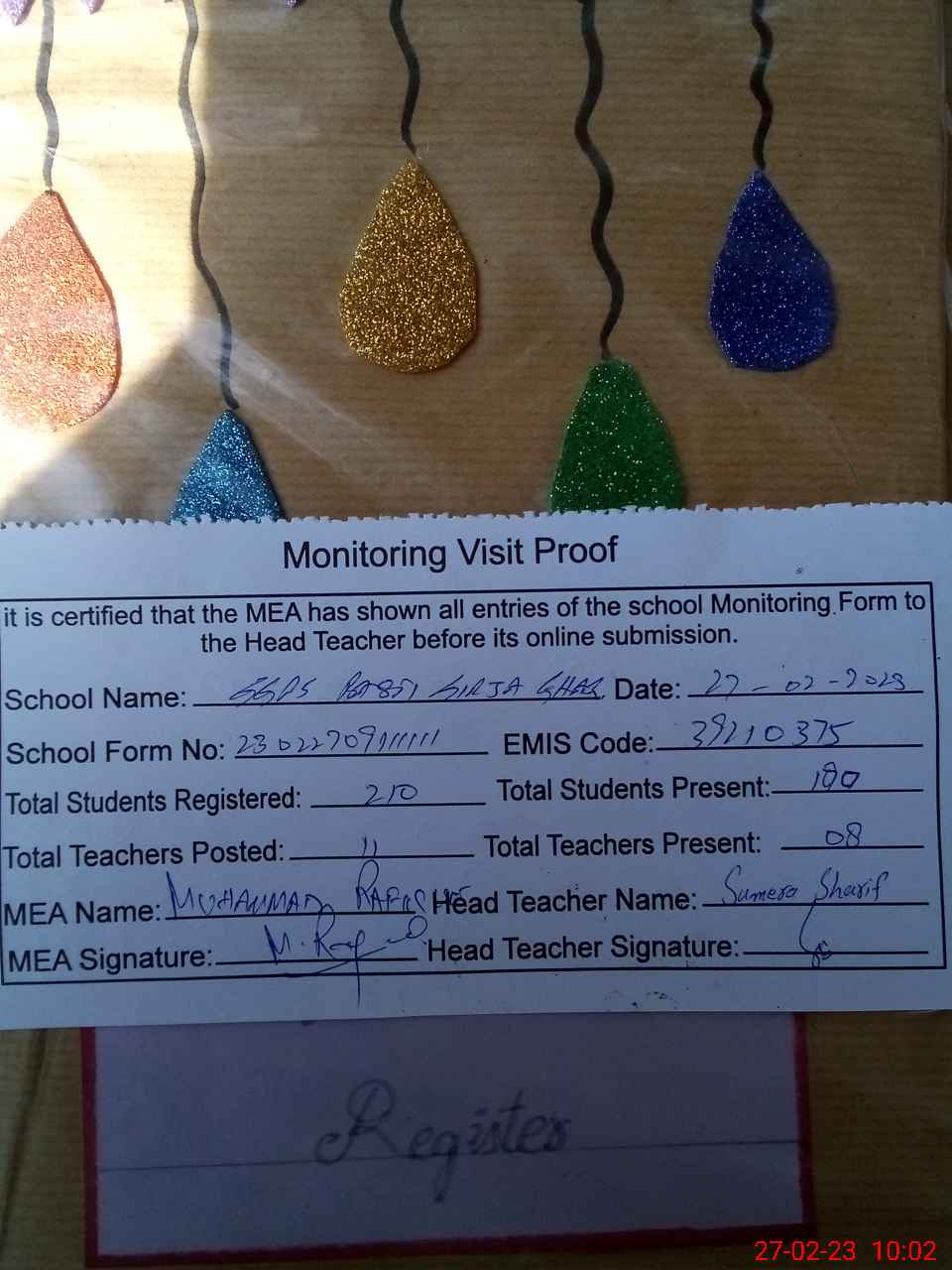 | Attendance Register | Head Teacher | MEA with School | Visit Proof |