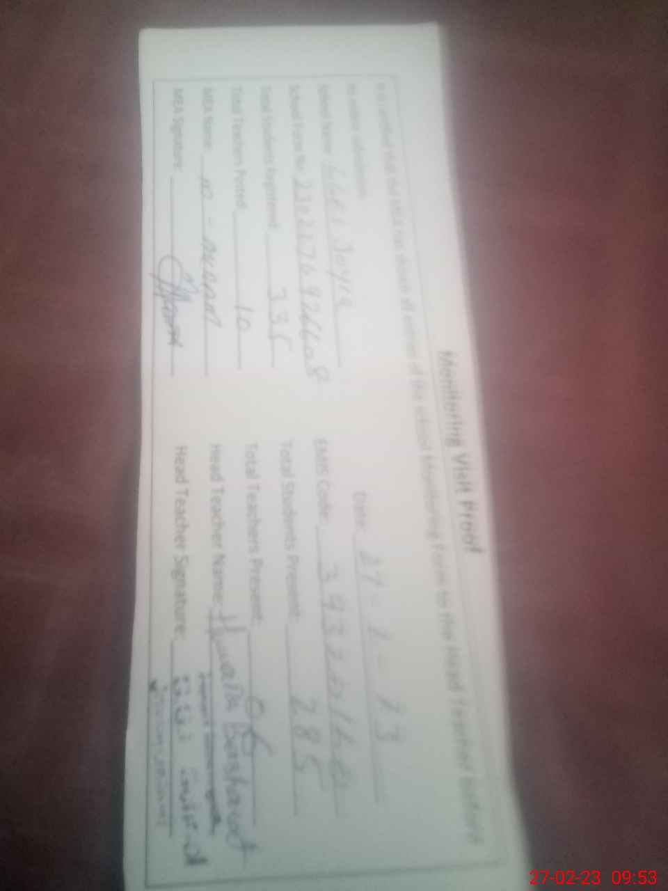 | Attendance Register | Head Teacher | MEA with School | Visit Proof |
