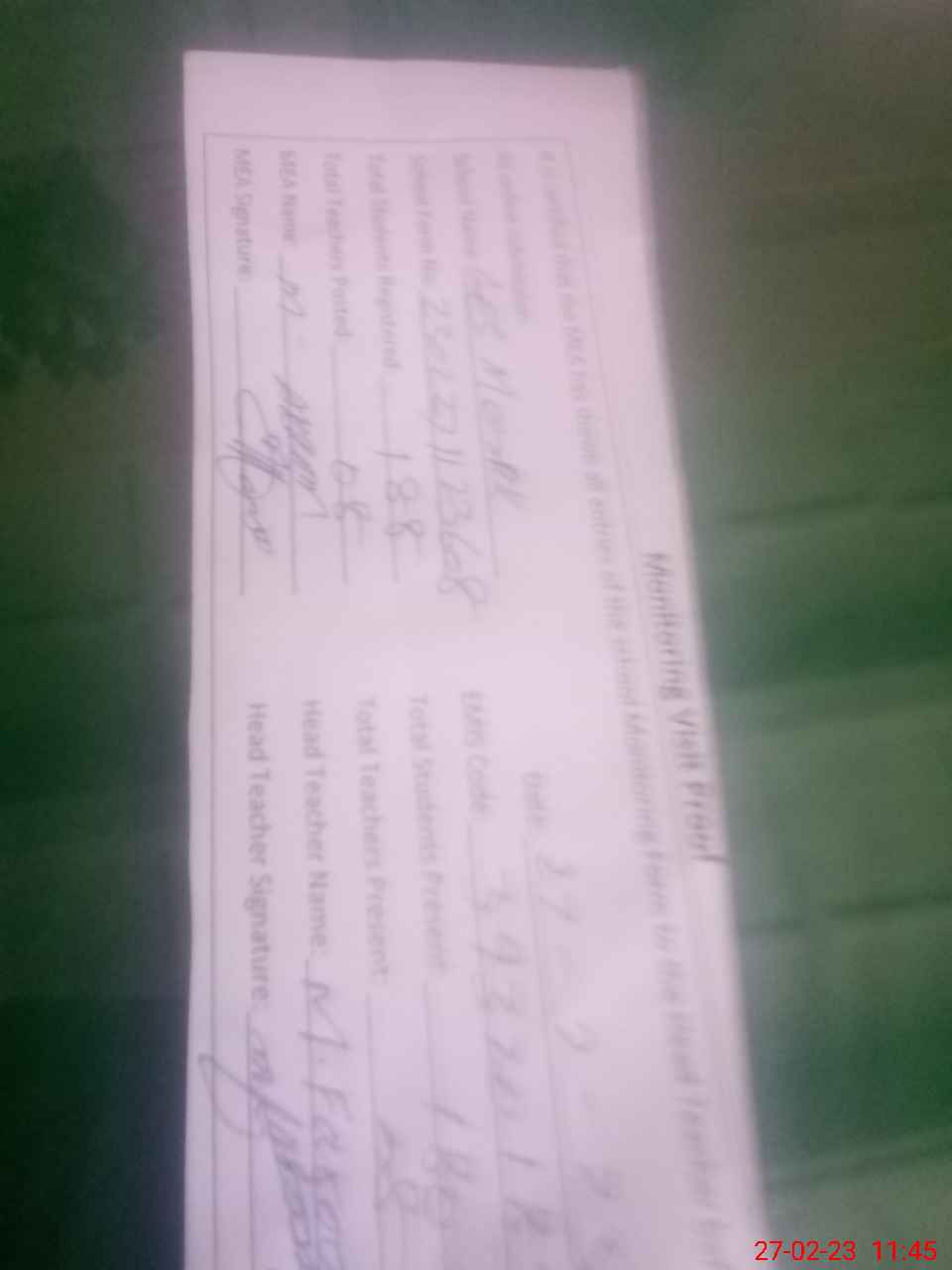 | Attendance Register | Head Teacher | MEA with School | Visit Proof |