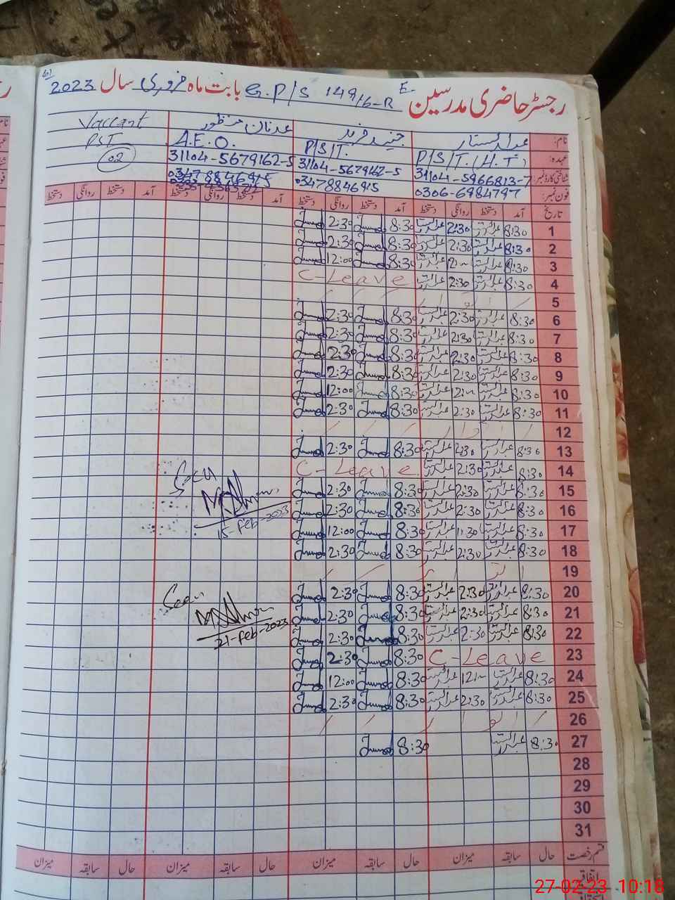 | CNIC | Full Name | Designation | R/C | Absence During Last Calender Month |