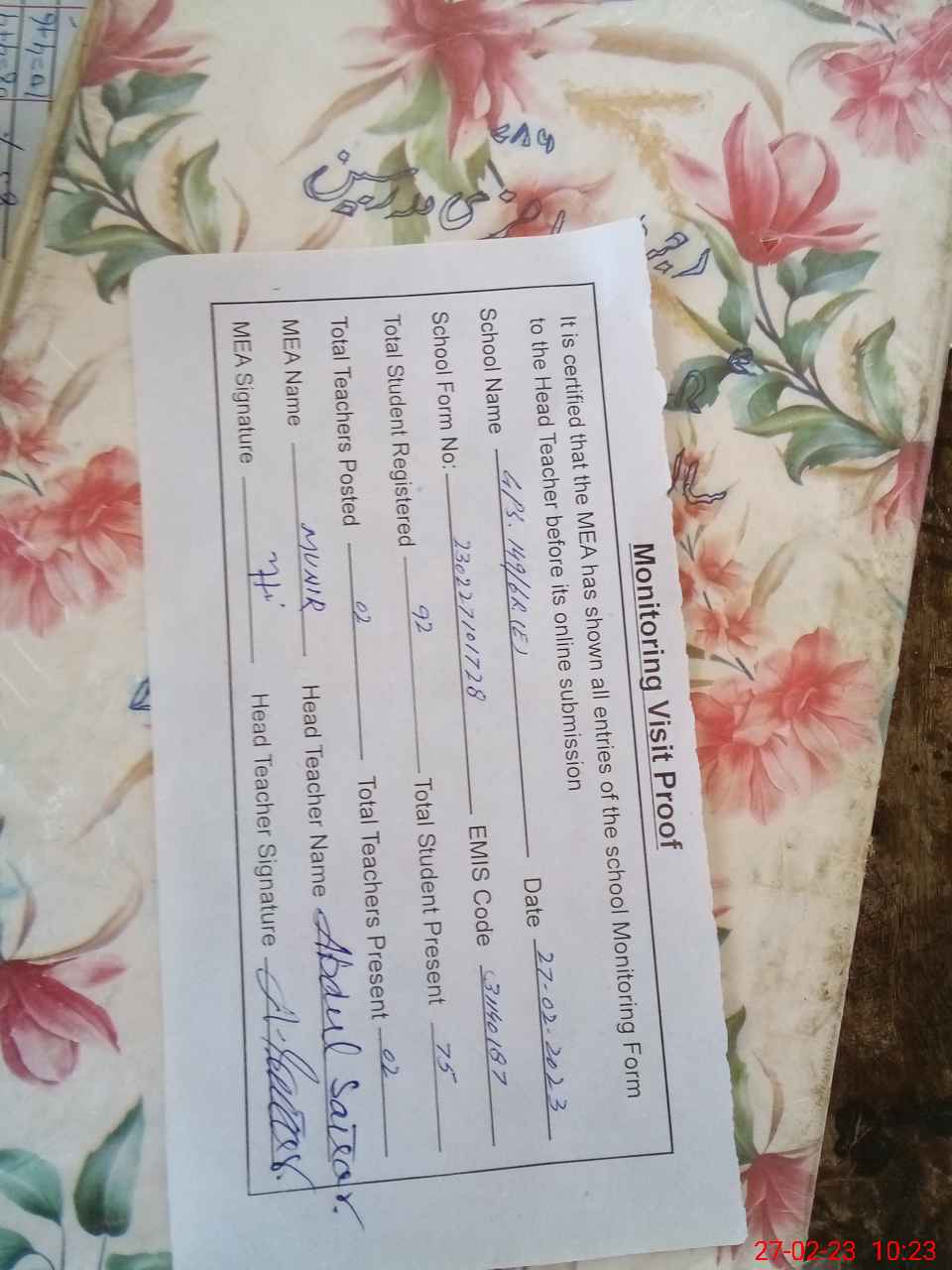 | Attendance Register | Head Teacher | MEA with School | Visit Proof |