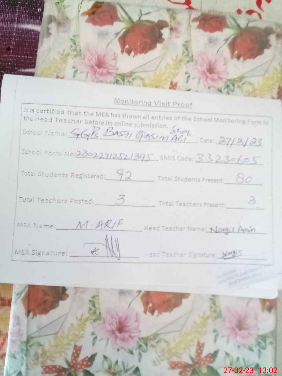 | Attendance Register | Head Teacher | MEA with School | Visit Proof |