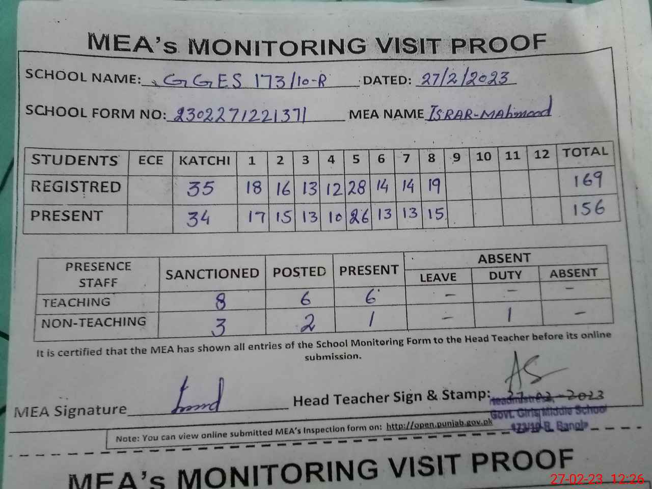 | Monitoring Date: 27-02-2023 | Start Time: 27-02-2023 11:52 AM | End Time: 27-02-2023 01:09 PM | Name of MEA: Is**** Me**** | |