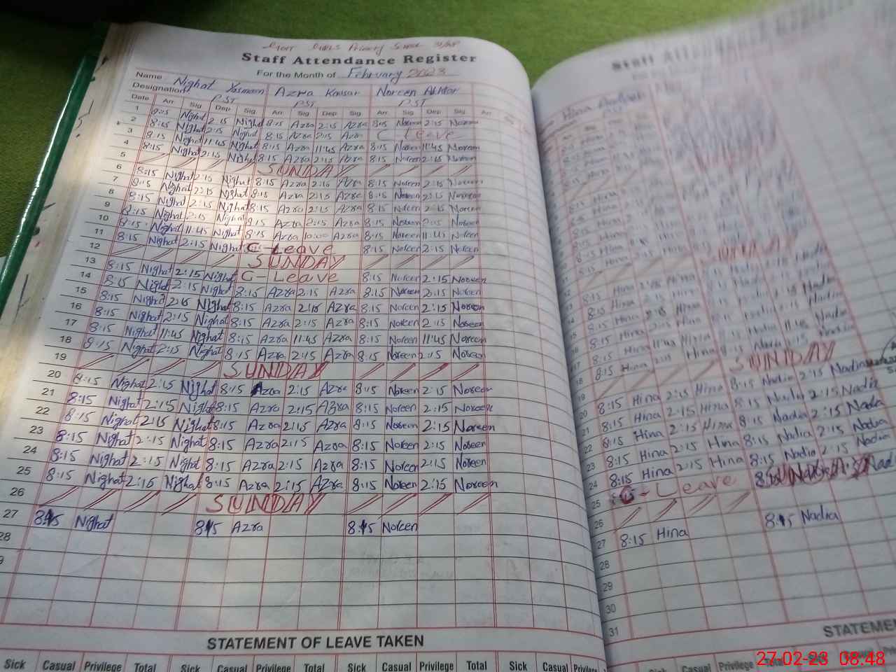 | Leave | Duty | Absent | Maternity | Medical | Ex- Pak |