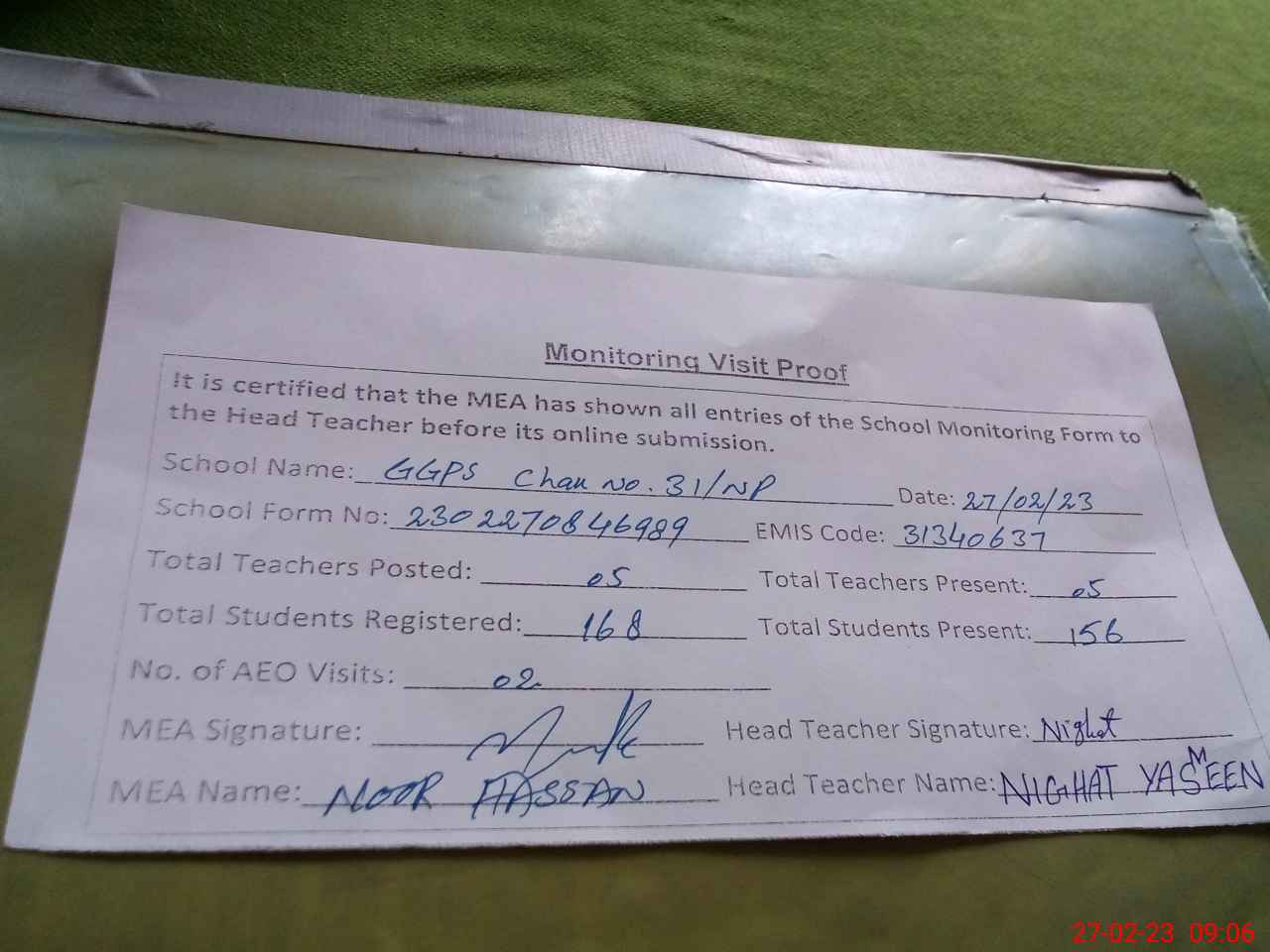 | Attendance Register | Head Teacher | MEA with School | Visit Proof |