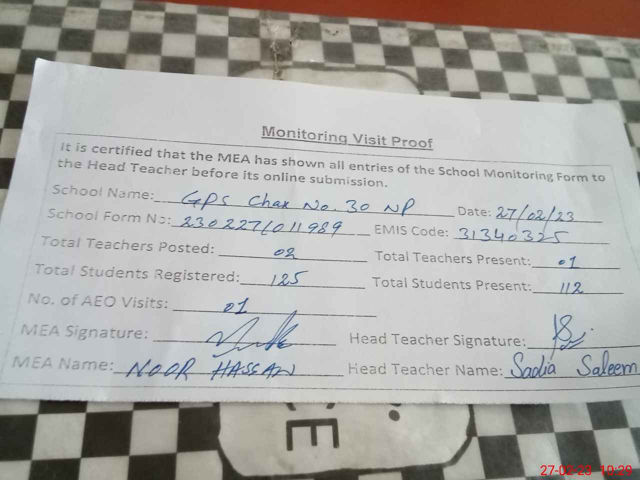 | EMIS Code: 31340325 | Name of School: GPS CHAK NO 30/NP | |||