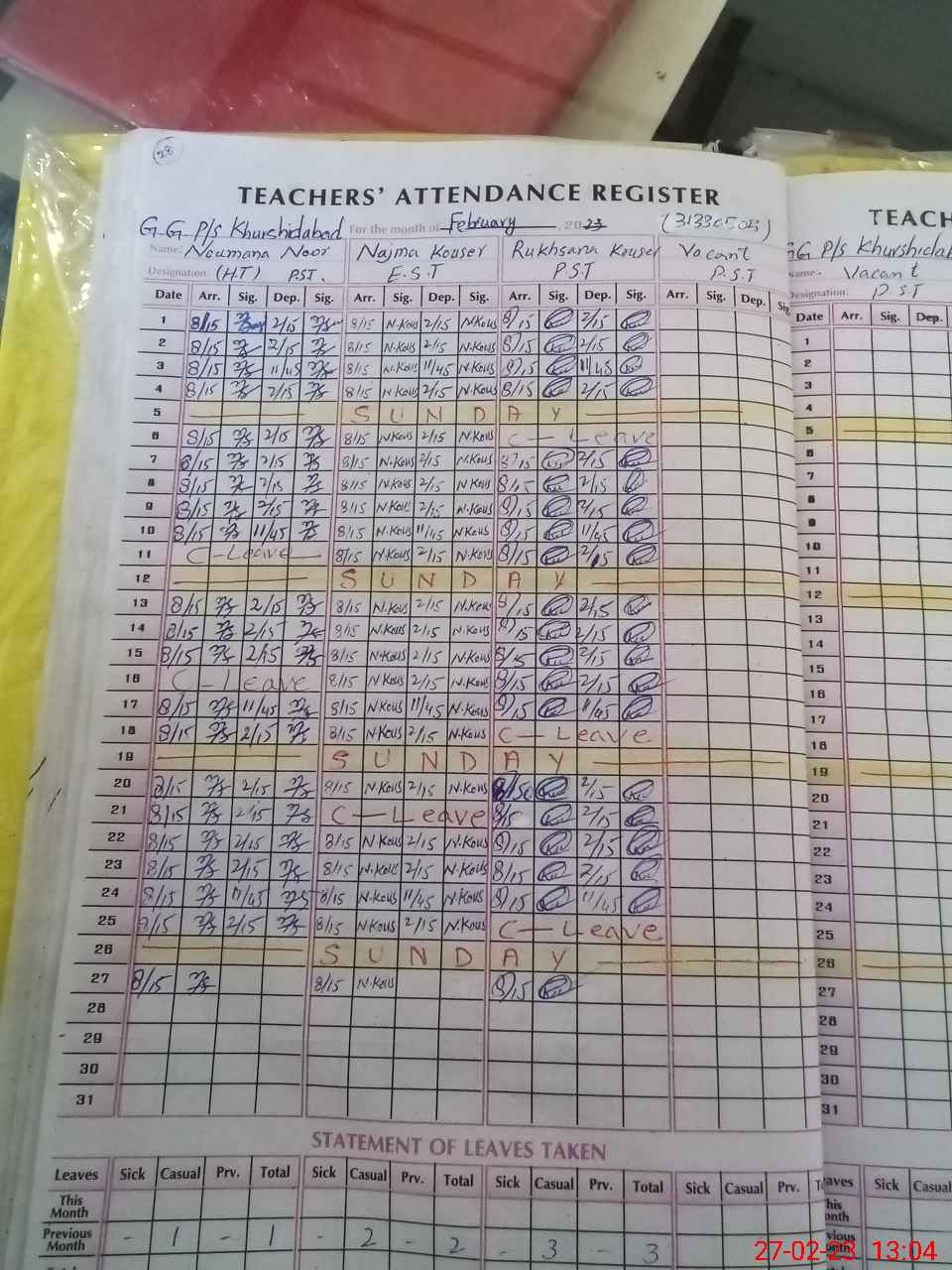 | Leave | Duty | Absent | Maternity | Medical | Ex- Pak |