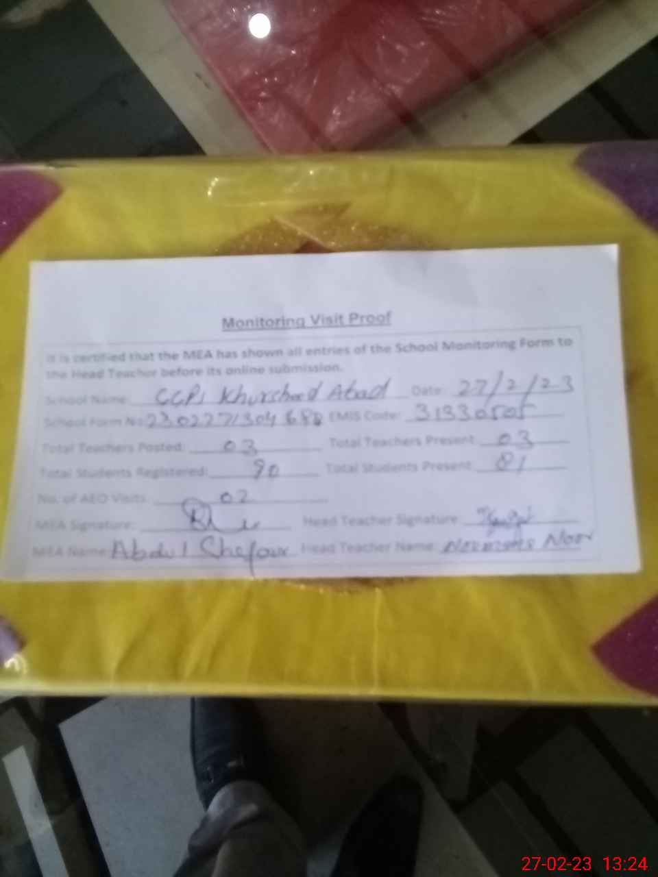 | Attendance Register | Head Teacher | MEA with School | Visit Proof |