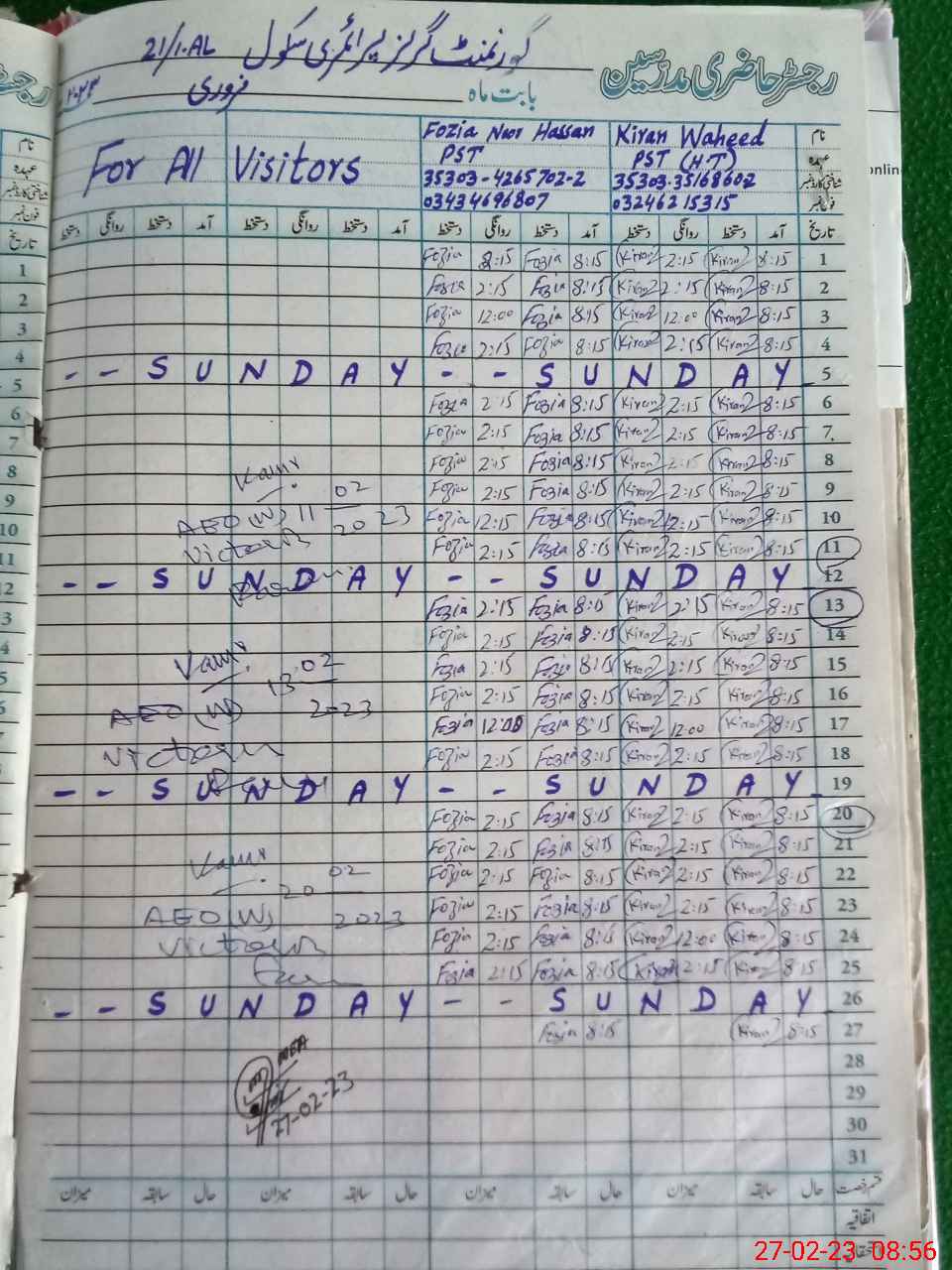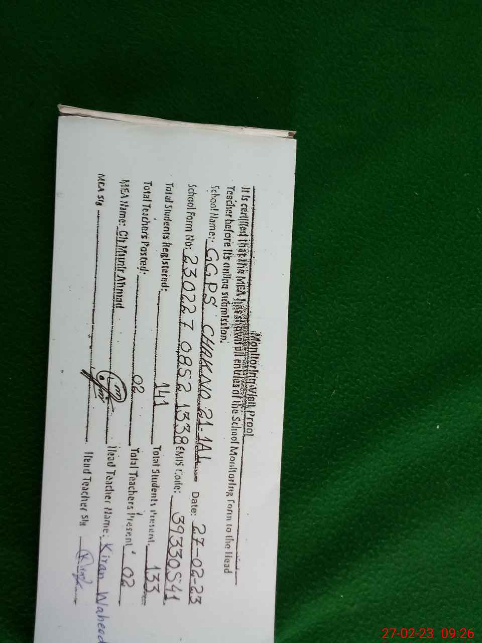 | Name: KI**** WA**** Designation: (School Headmaster's/Headmistress's) PST Phone/Cell Number: 03**** |
