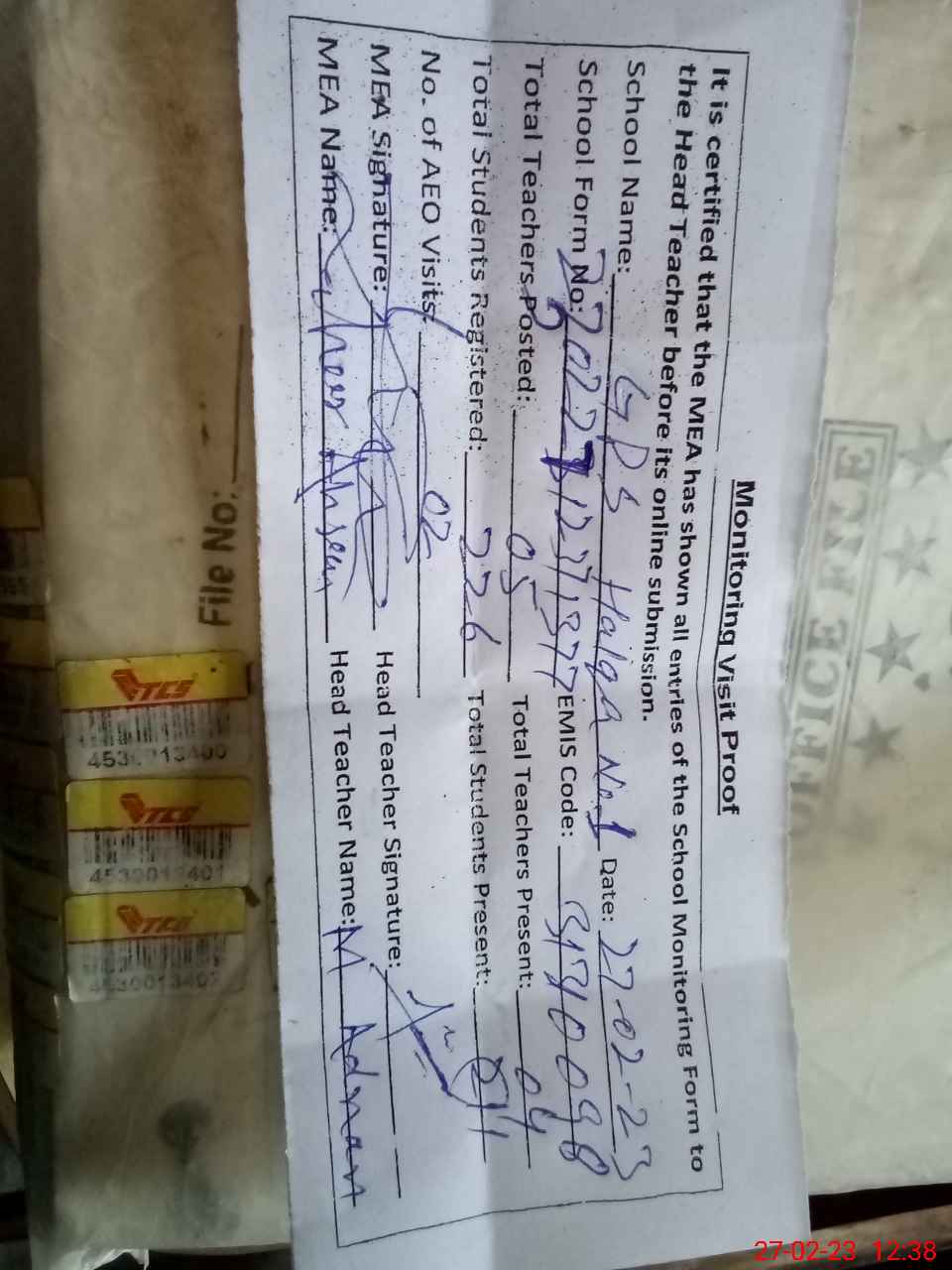 | Attendance Register | Head Teacher | MEA with School | Visit Proof |