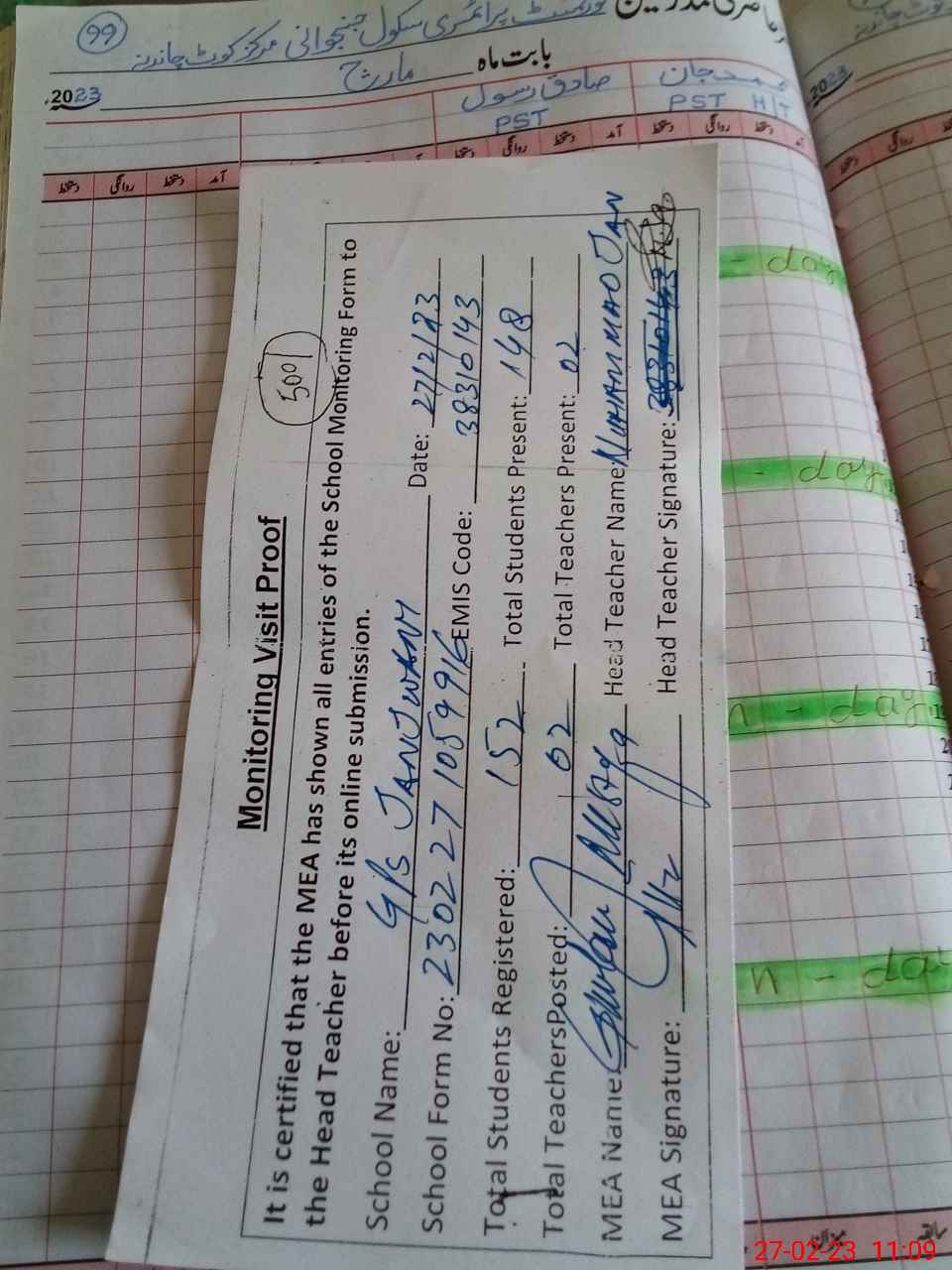 | Attendance Register | Head Teacher | MEA with School | Visit Proof |