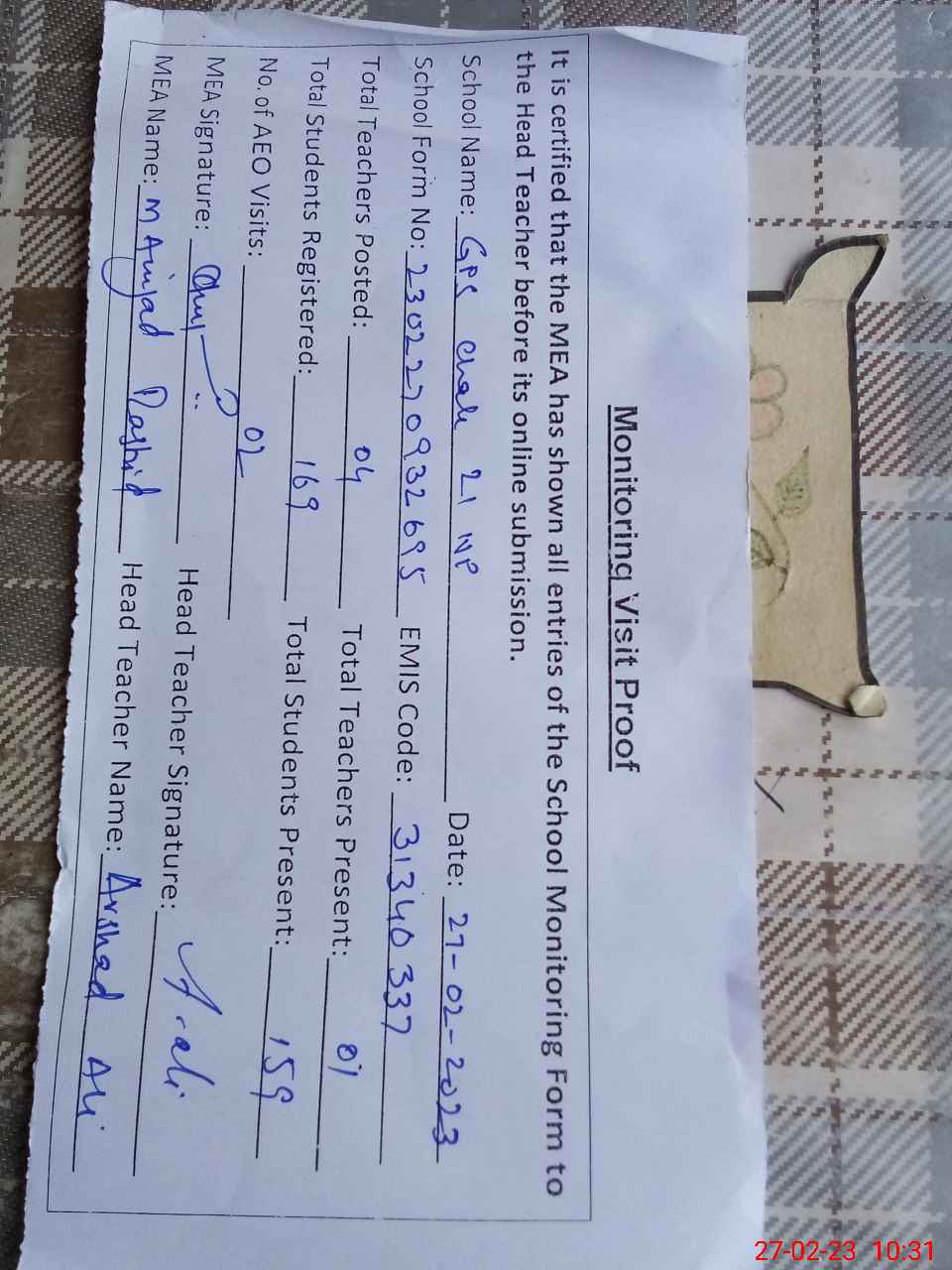 | Attendance Register | Head Teacher | MEA with School | Visit Proof |