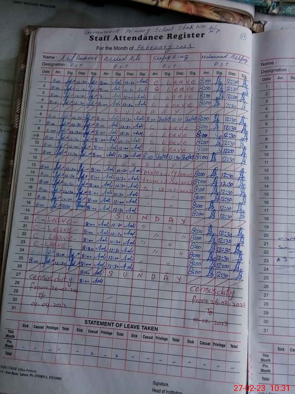| 31**** | Sh**** Ri**** | PST | Regular | 0 | 0 | 0 | 0 | 0 | 0 | 0 | 0 | 0 | Maternity |