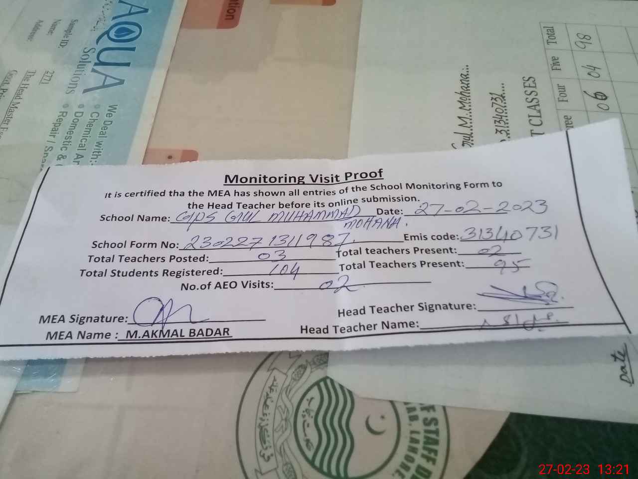| Attendance Register | Head Teacher | MEA with School | Visit Proof |