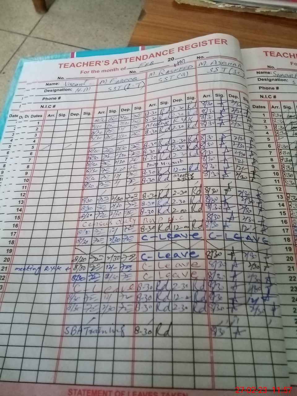 | CNIC | Full Name | Designation | R/C | Absence During Last Calender Month |