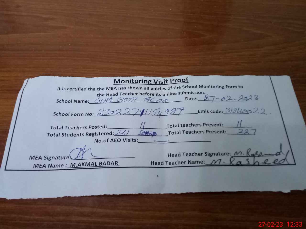 | Attendance Register | Head Teacher | MEA with School | Visit Proof |