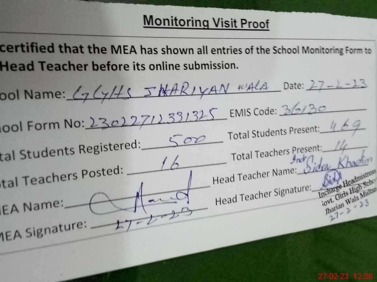 | EMIS Code: 36130100 | Name of School: GGHS JHARIYAN WALA MOUZA MADINA MULTAN | |||