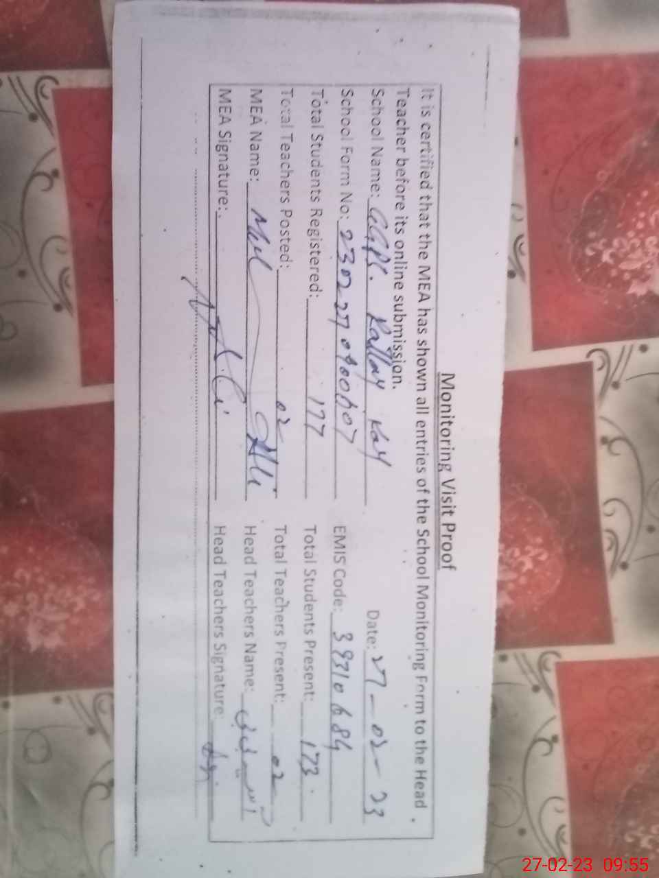 | Attendance Register | Head Teacher | MEA with School | Visit Proof |