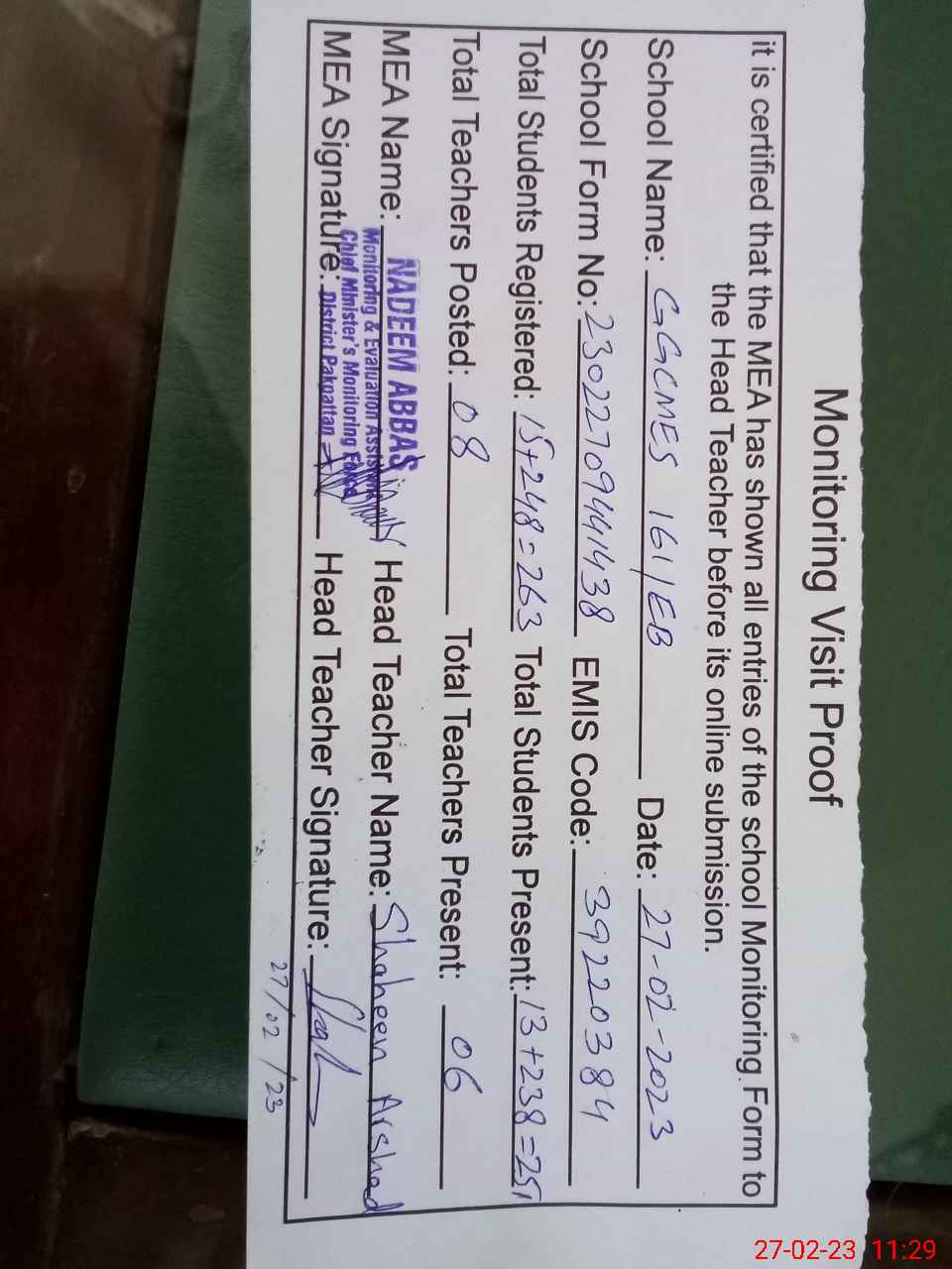 | EMIS Code: 39220384 | Name of School: GGCMES 161 EB ARIFWALA | |||