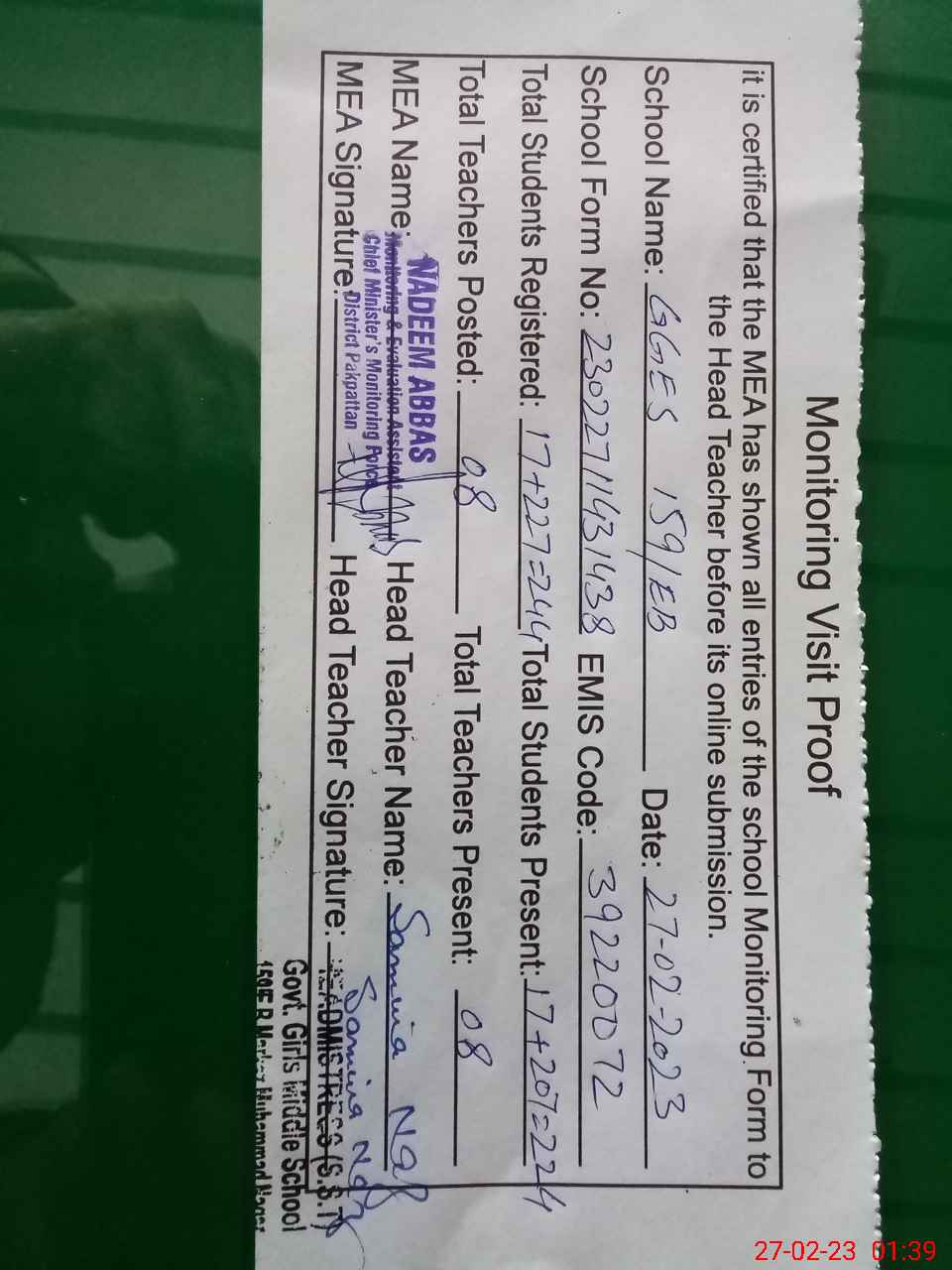 | Certified that this School was Inspected by the Undersigned MEA/DMO Today and the Information Stated Above is as Per Record. | |||||