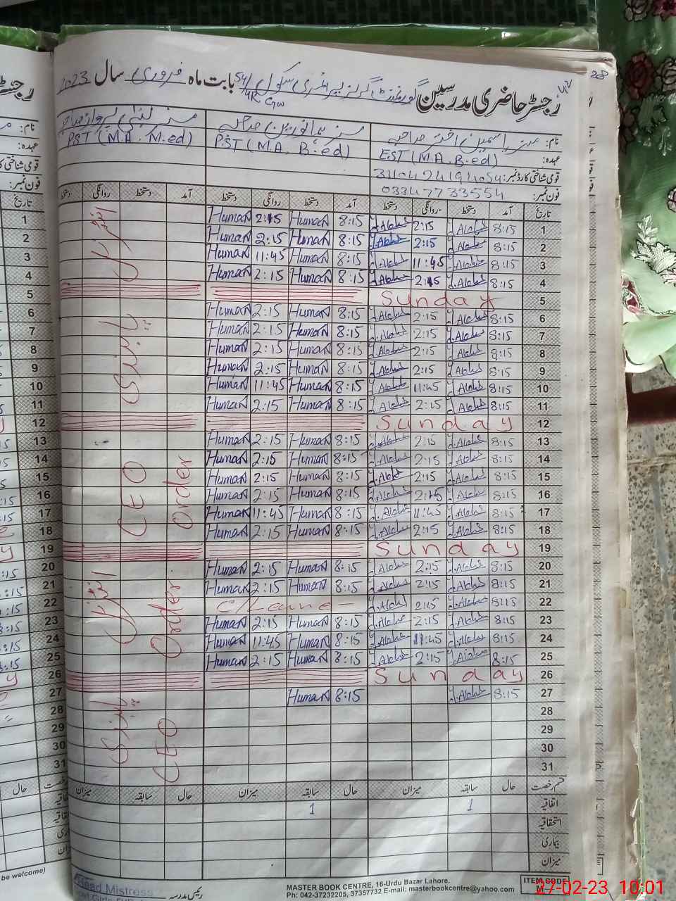 | CNIC | Full Name | Designation | R/C | Absence During Last Calender Month |