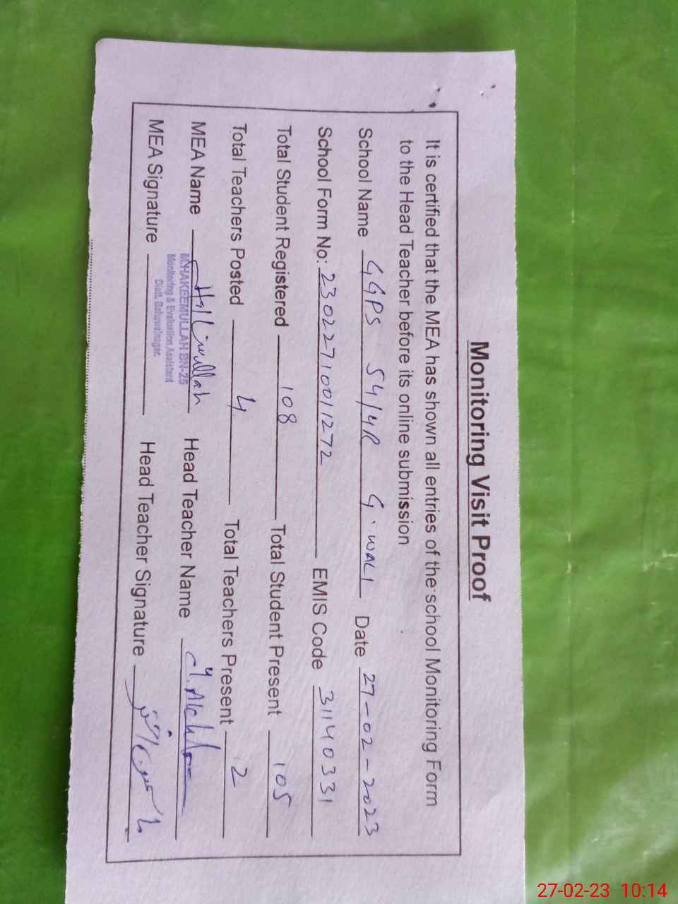 | Attendance Register | Head Teacher | MEA with School | Visit Proof |