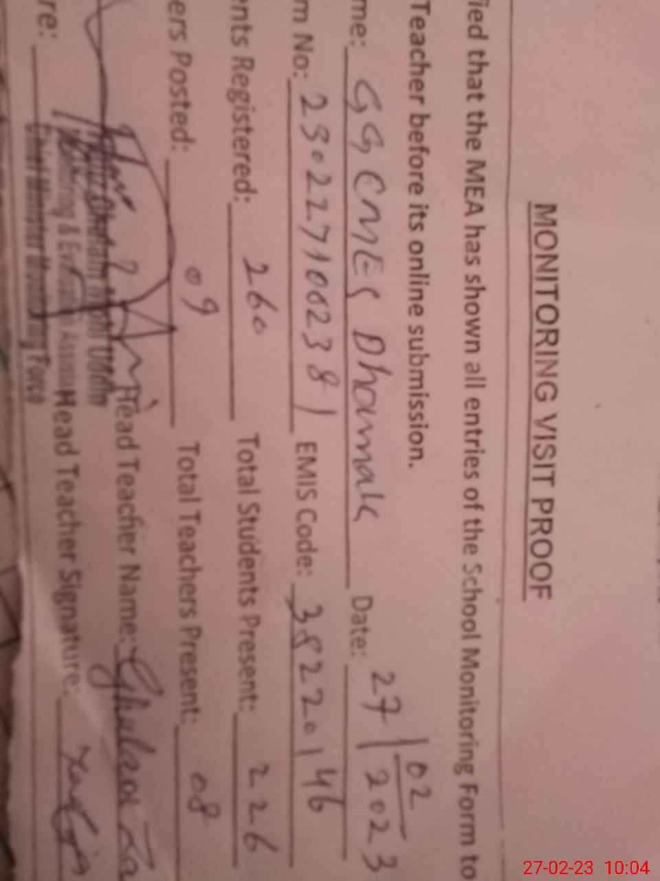 | Attendance Register | Head Teacher | MEA with School | Visit Proof |
