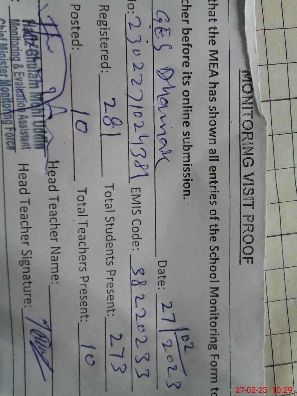 | Attendance Register | Head Teacher | MEA with School | Visit Proof |