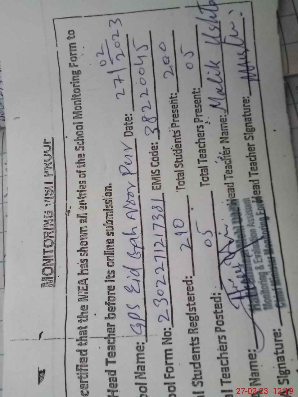 | EMIS Code: 38220045 | Name of School: GPS EID GAH NOOR PUR | |||