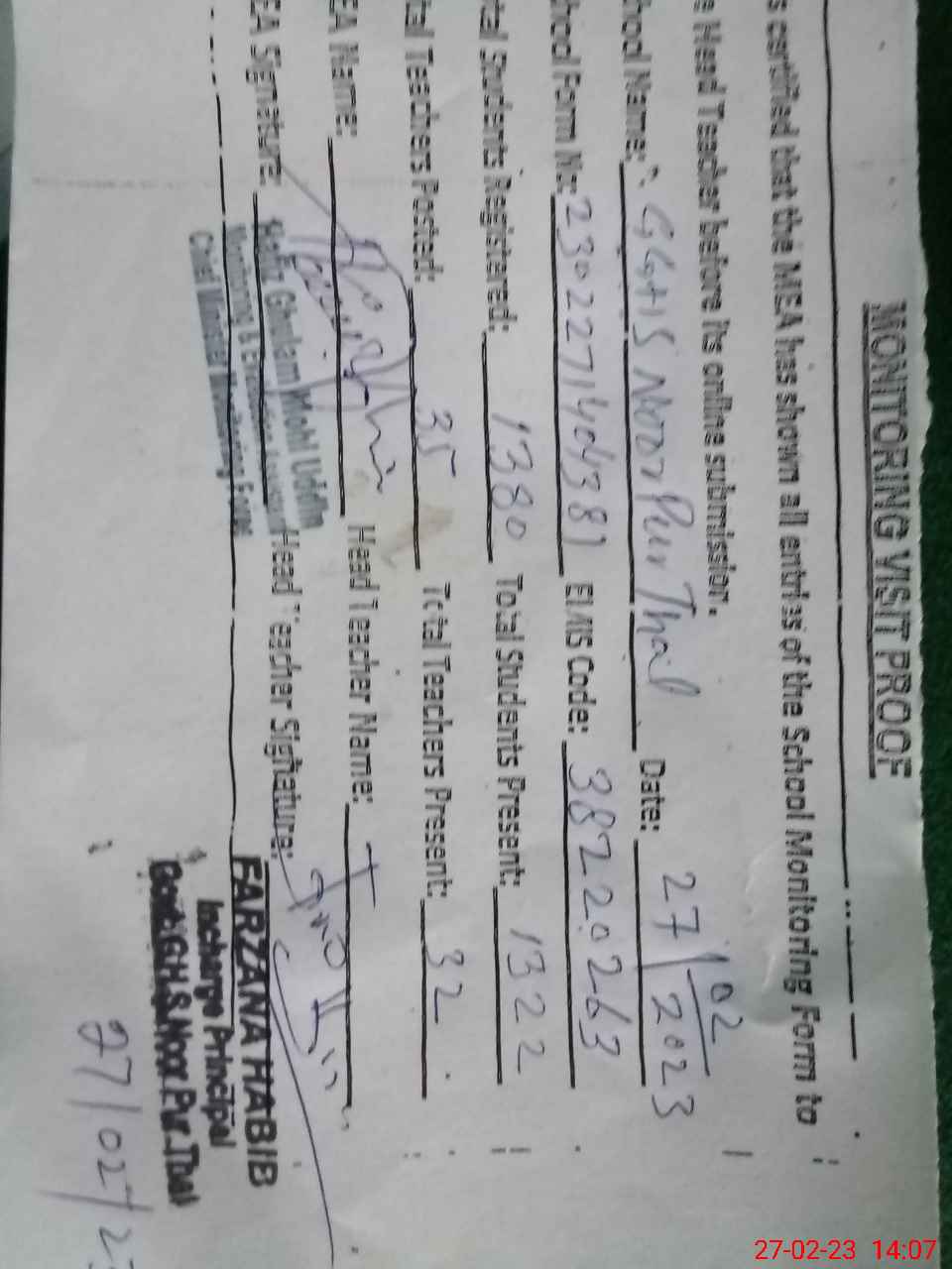 | Attendance Register | Head Teacher | MEA with School | Visit Proof |