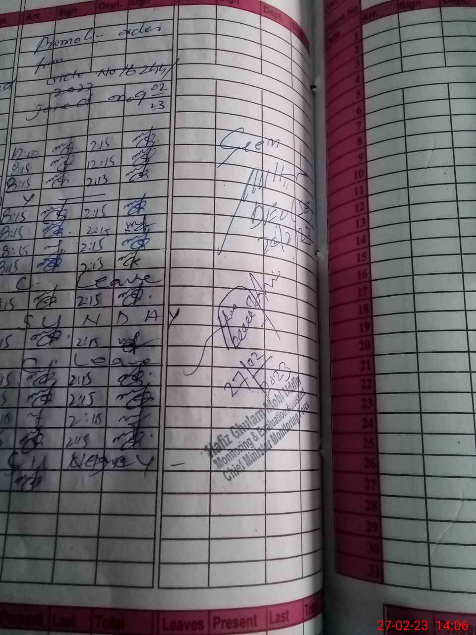 | CNIC | Full Name | Designation | R/C | Absence During Last Calender Month |