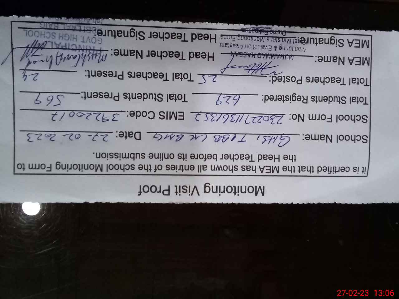 | Certified that this School was Inspected by the Undersigned MEA/DMO Today and the Information Stated Above is as Per Record. | |||||