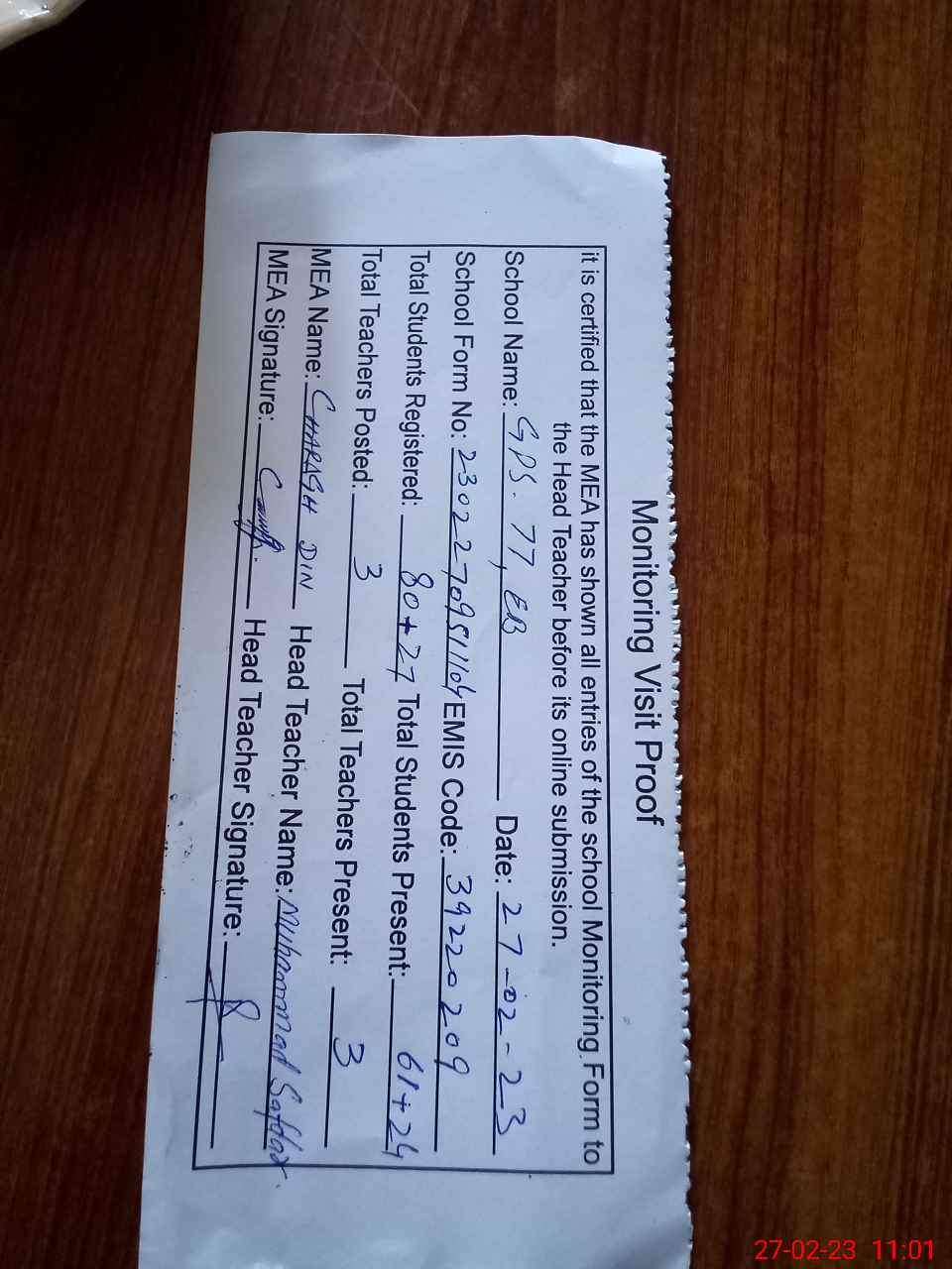| Attendance Register | Head Teacher | MEA with School | Visit Proof |