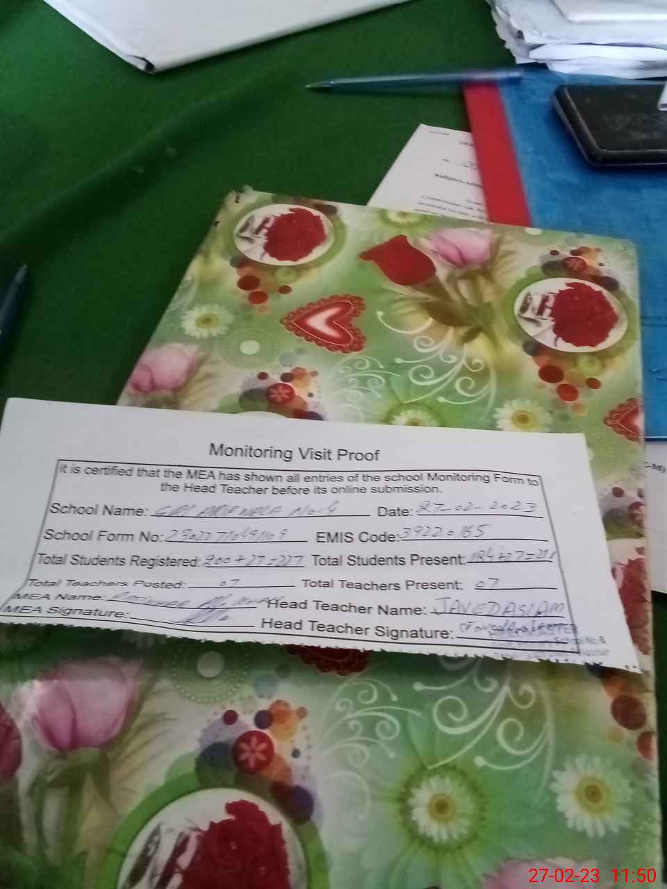 | Attendance Register | Head Teacher | MEA with School | Visit Proof |