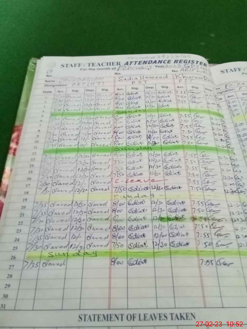 | Leave | Duty | Absent | Maternity | Medical | Ex- Pak |