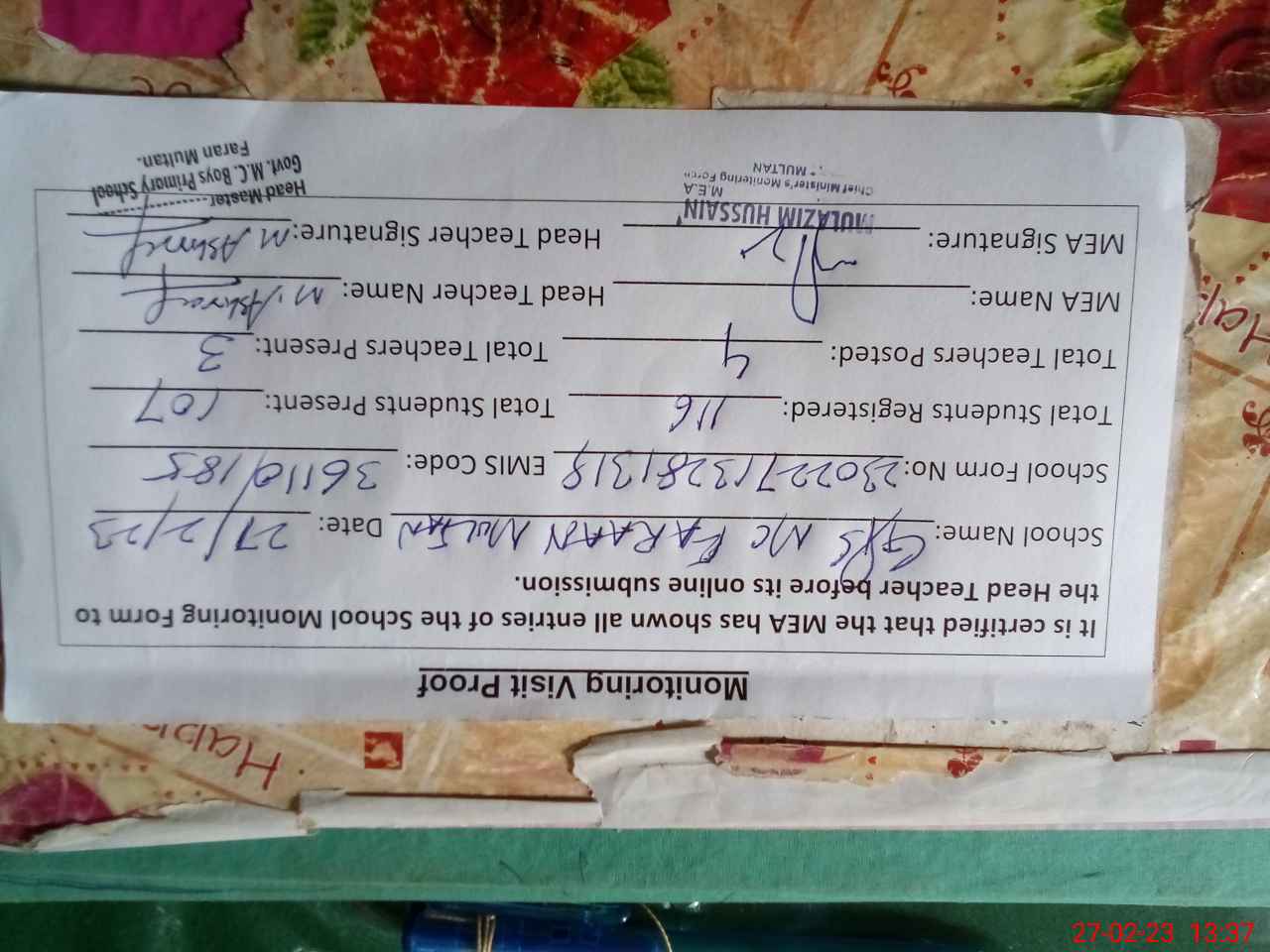 | EMIS Code: 36110185 | Name of School: GPS MC FARAAN NEAR KHONI BURJ MULTAN | |||
