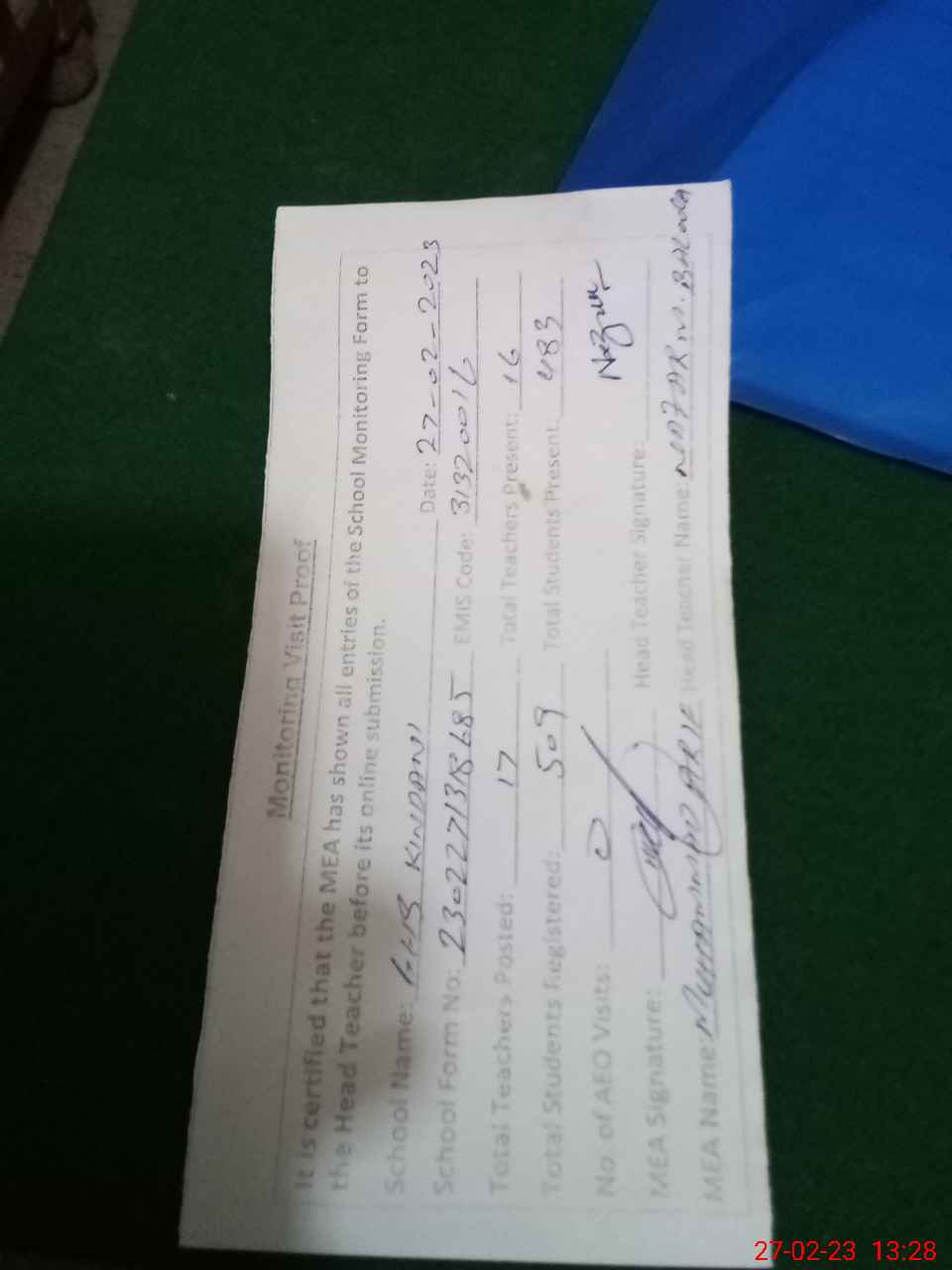 | Attendance Register | Head Teacher | MEA with School | Visit Proof |