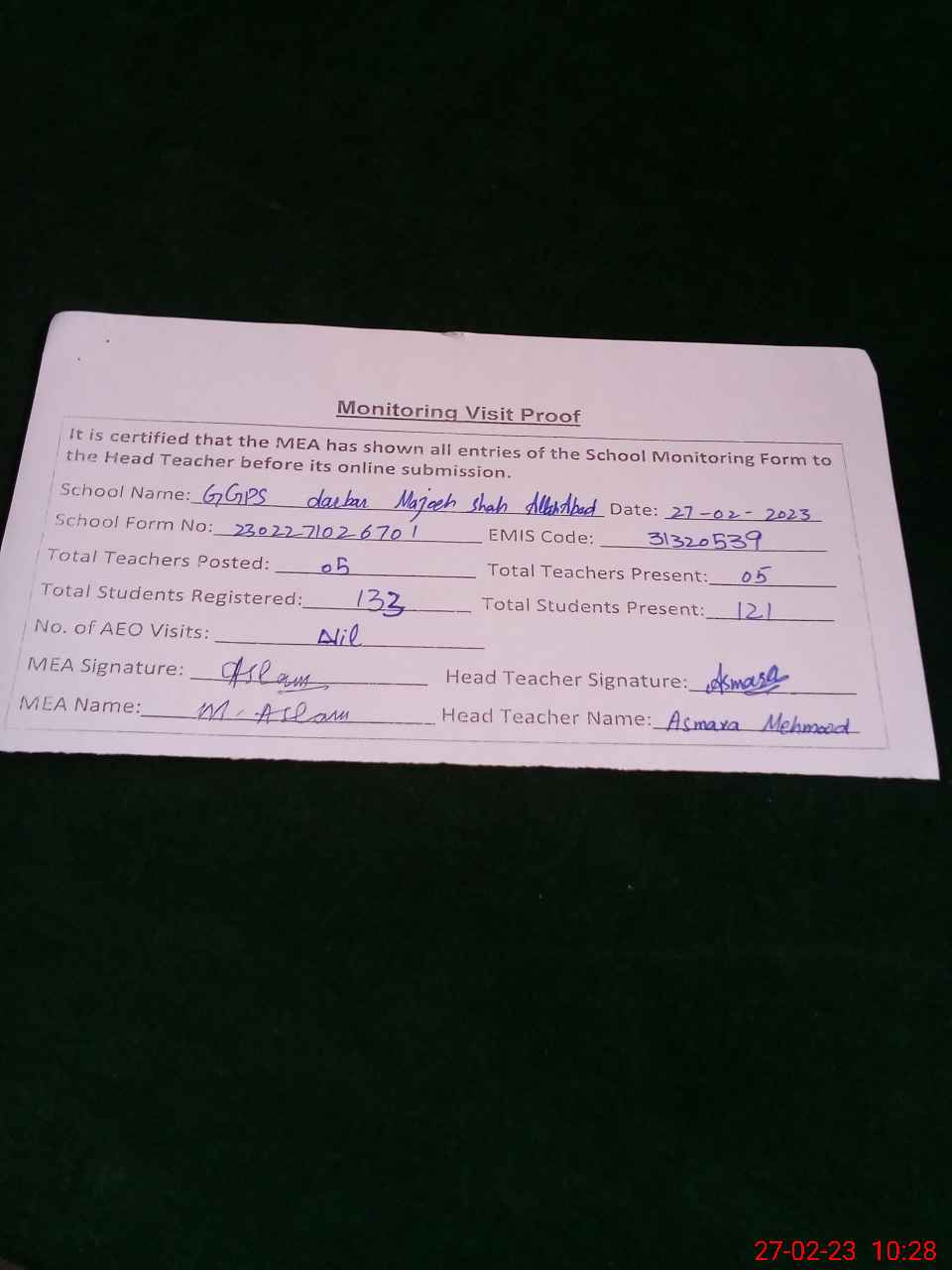 | Attendance Register | Head Teacher | MEA with School | Visit Proof |