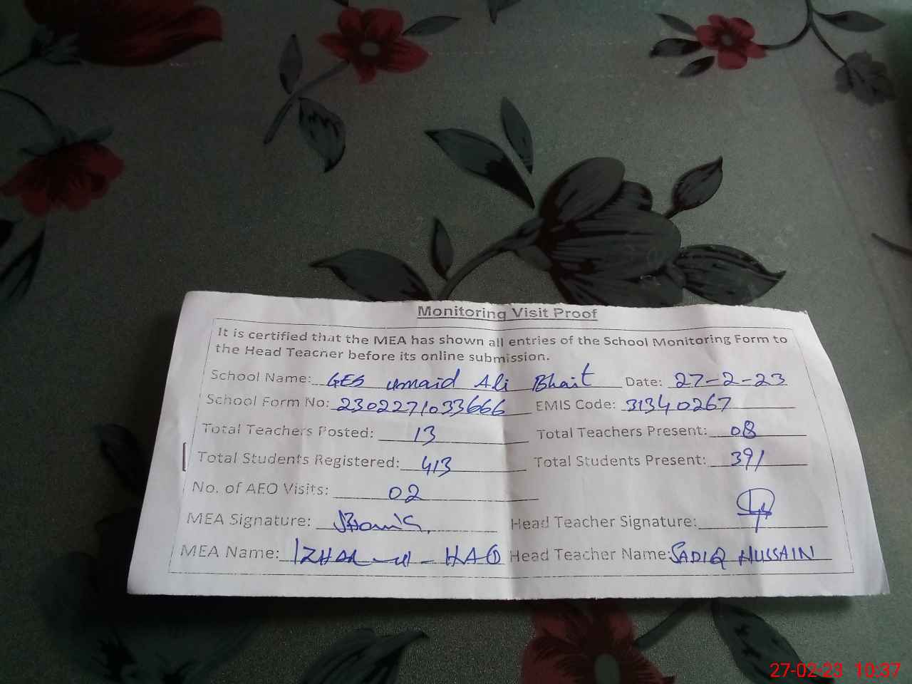 | Attendance Register | Head Teacher | MEA with School | Visit Proof |
