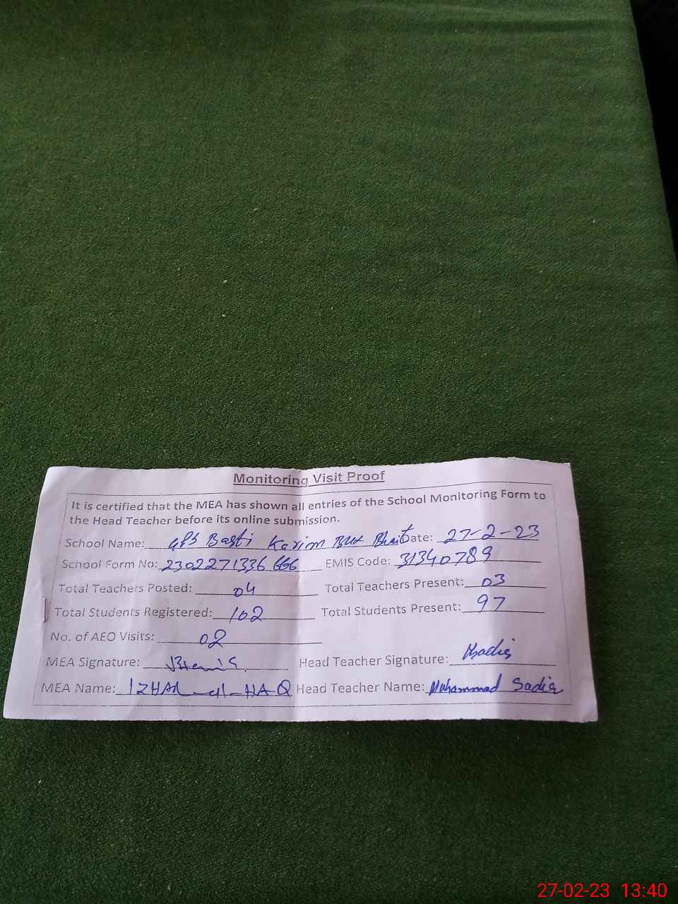 | EMIS Code: 31340789 | Name of School: GPS BASTI KARIM BAKHSH BHAIT | |||