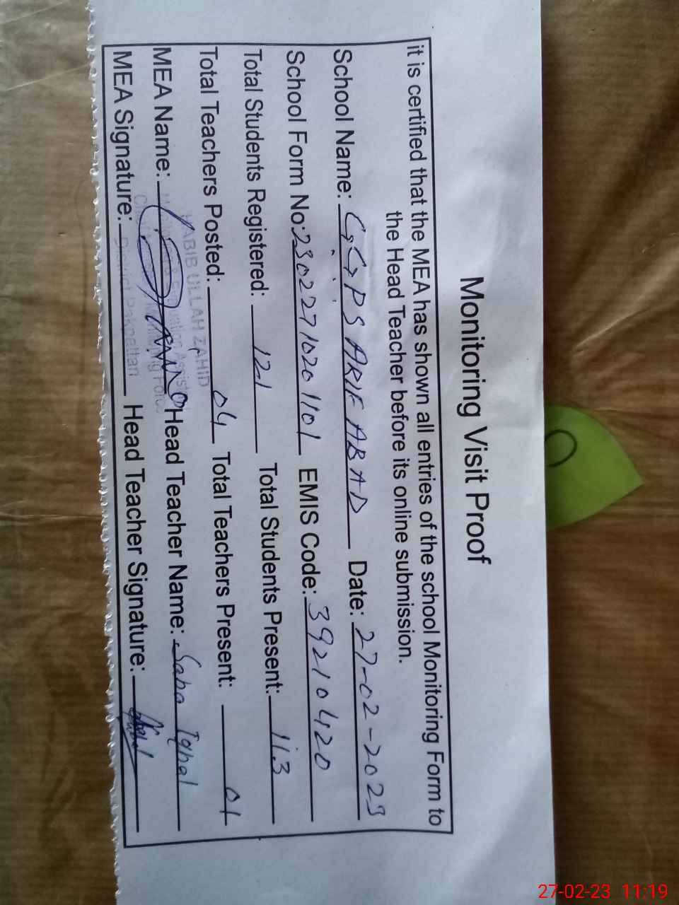 | Attendance Register | Head Teacher | MEA with School | Visit Proof |