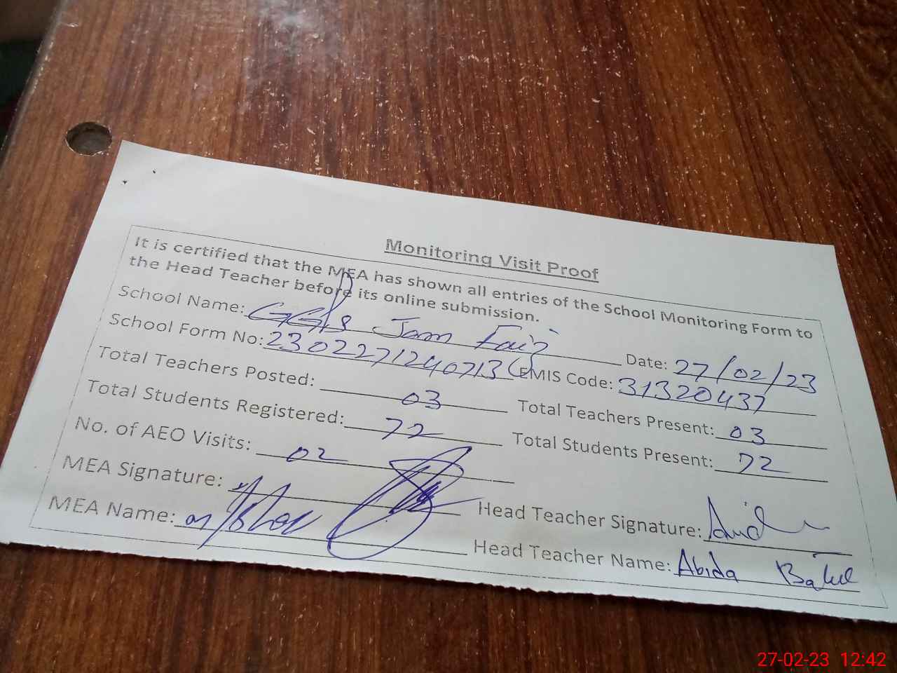 | Attendance Register | Head Teacher | MEA with School | Visit Proof |